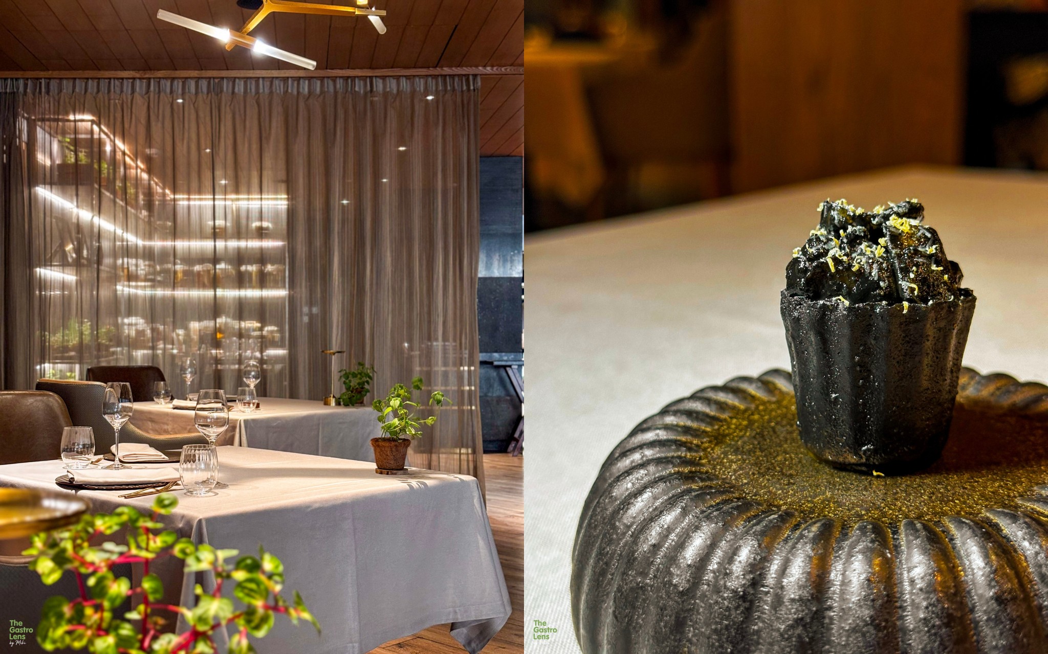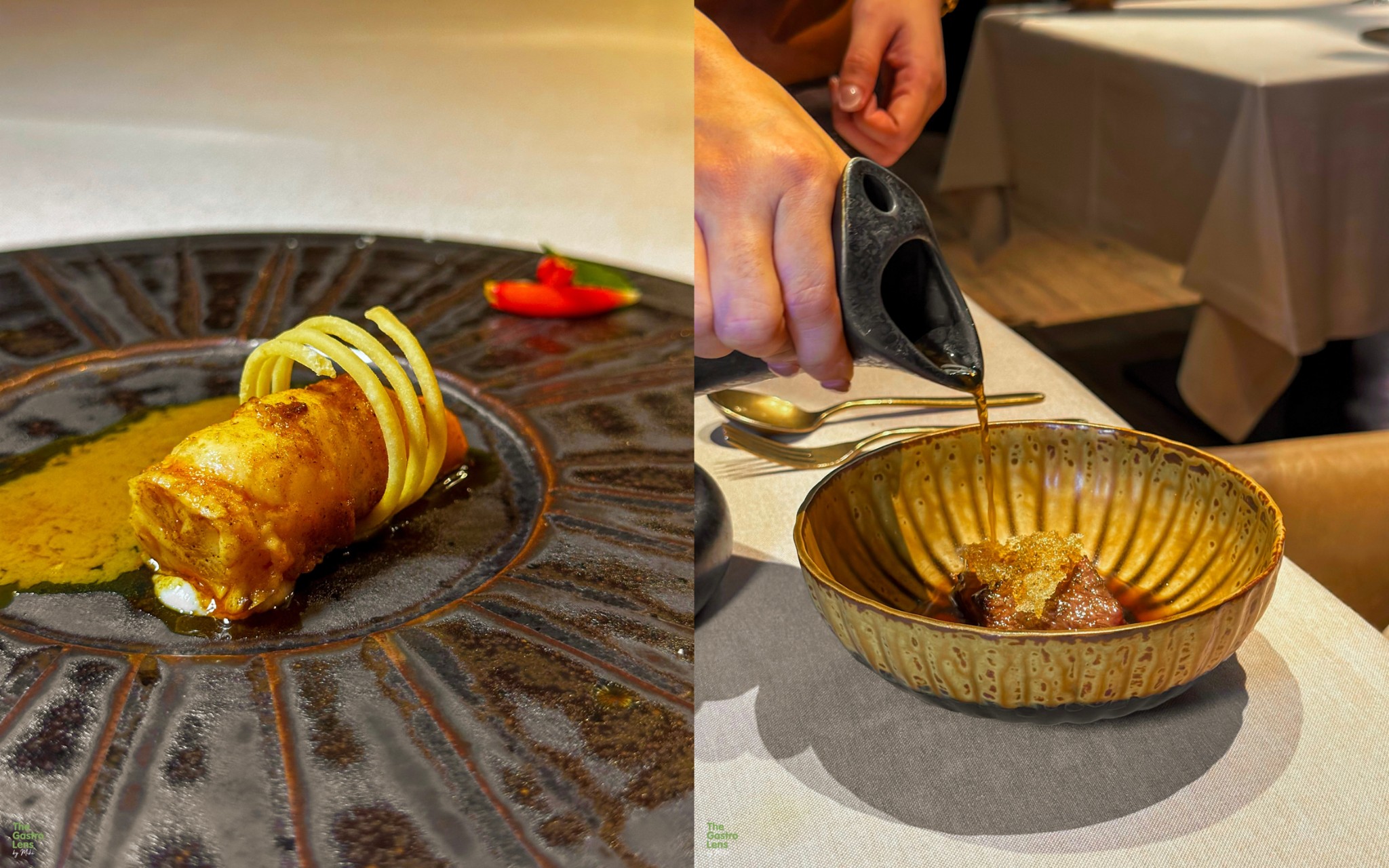 หมึกน้ำดำ - เปิดคอร์สหลักด้วยทาร์ตปลาหมึกที่ให้ความกรุบกรอบ ผสานกับซอสน้ำดำที่หอมกลิ่นทะเลและมีความอูมามิเข้มข้น ตัดเลี่ยนด้วยยำผักกระเฉดน้ำที่ให้รสเปรี้ยวสดชื่นและเท็กซ์เจอร์กรุบๆ