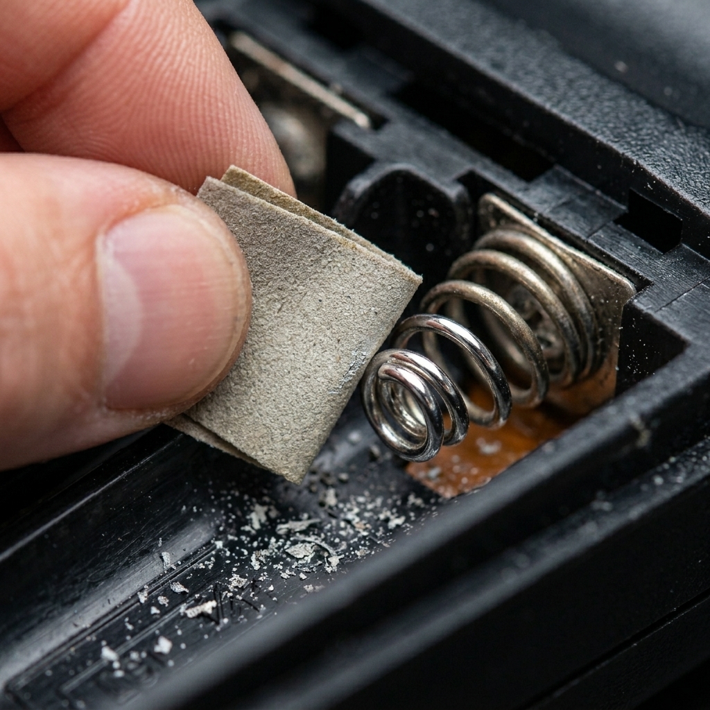 3. ขัดขั้วให้เงา: ใช้กระดาษทรายหรือตะไบเล็บ ขัดเบาๆ ที่ขั้วสปริงเพื่อให้หน้าสัมผัสโลหะสะอาดที่สุด ไฟจะได้เดินสะดวกครับ