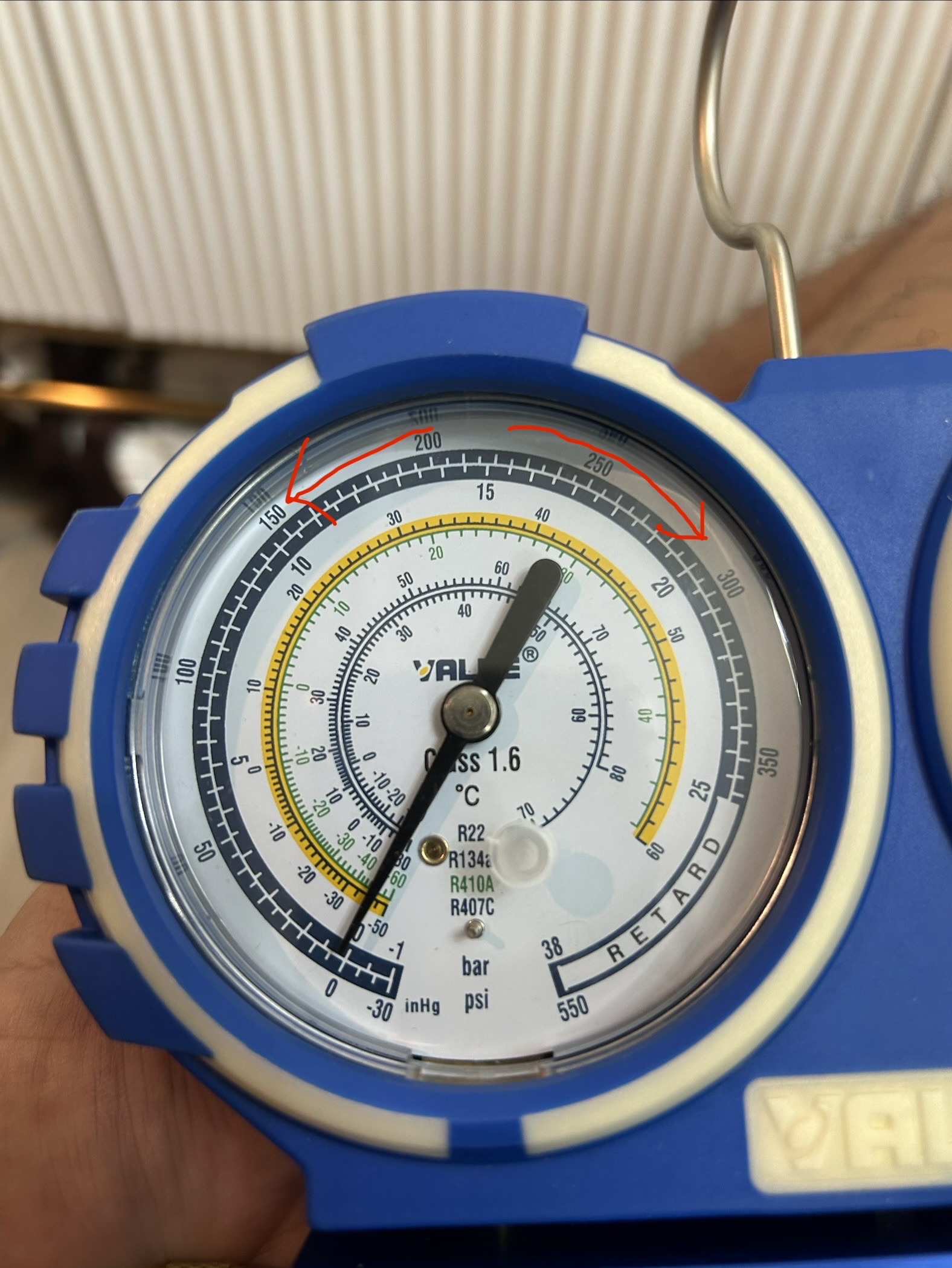 รบกวนสอบถามพี่ๆครับ ดูแรงดันน้ำยาแอร์บ้าน R32 วงนอกสุดใช่ไหมครับ ตามลูกศรแดง -30 ถึง 350 psi