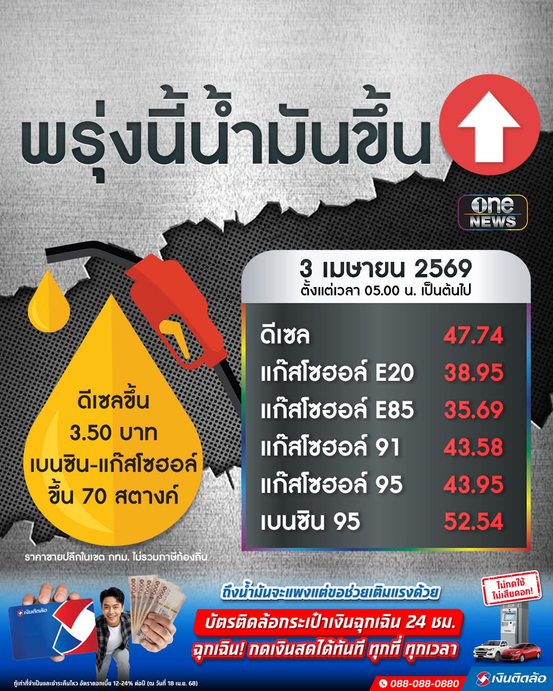 พรุ่งนี้ดีเซล ขึ้นอีก 3.50 บาท กลุ่มเบนซิน-แก๊สโซฮอล์ 70 สต.