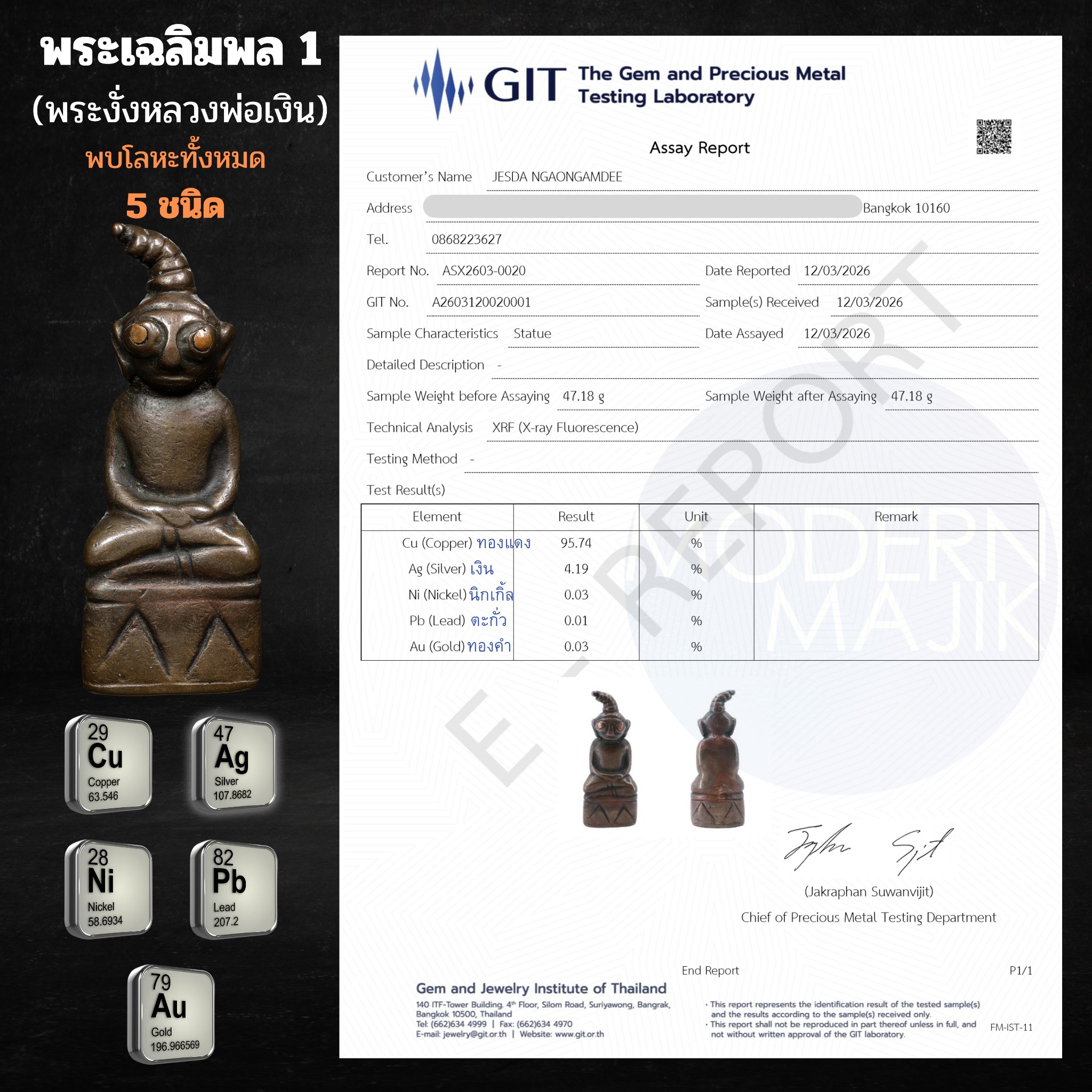 I submitted 3 Phra Chalermphon pieces for testing, and the lab results from GIT clearly confirm: this set is not just ordinary cast brass. It is a special alloy containing a high percentage of silver (Ag) at 3–4%, and even more surprisingly, traces of gold (Au) were also detected!