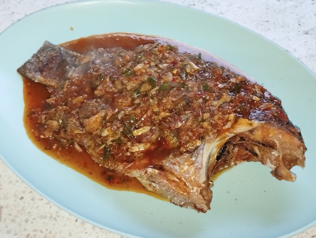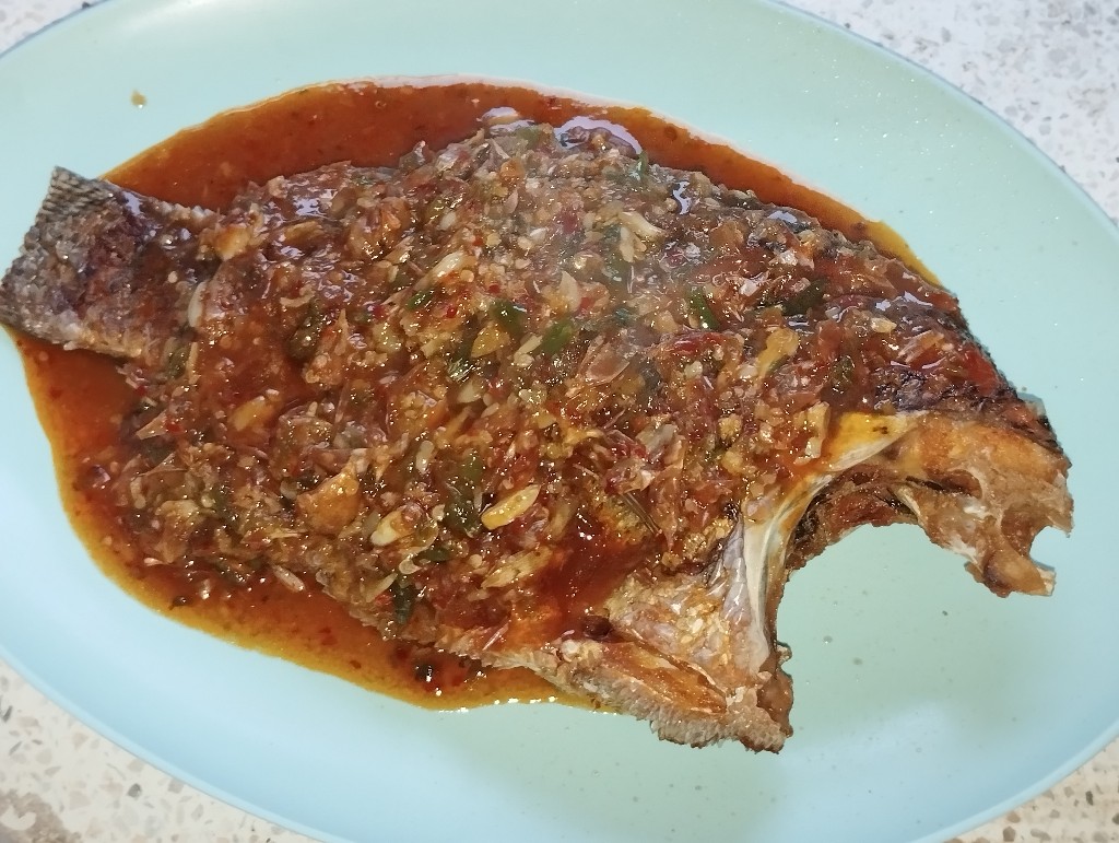 จากนั้นค่อยทำน้ำราด วันนี้อยากกินแบบเผ็ด ๆ แซ่บ ๆ ก็เลยทำด้วยการตำพริกขี้หนูสดประมาณสามสี่สิบเม็ดจนละเอียดแล้วค่อยใส่กระเทียมสดลงไปตำด้วย เรียบร้อยแล้วก็ตั้งกระทะใส่น้ำมัน รอจนร้อนก็ตักพริกแกงลงกระทะราวช้อนโต๊ะ รวนจนเริ่มแตกมันค่อยใส่พริกสดที่ตำไว้ลงไปรวนด้วย ปรุงรสด้วยน้ำมันหอย ฝาเขียว น้ำตาลทราย รสดีเล็กน้อย ใส่น้ำซุปลงไปด้วยเพื่อเพิ่มน้ำไว้คลุกข้าว ร้อนพอตามต้องการก็จัดการราดลงบนตัวปลาที่ทอดไว้แล้ว เป็นอันว่าเรียบร้อย