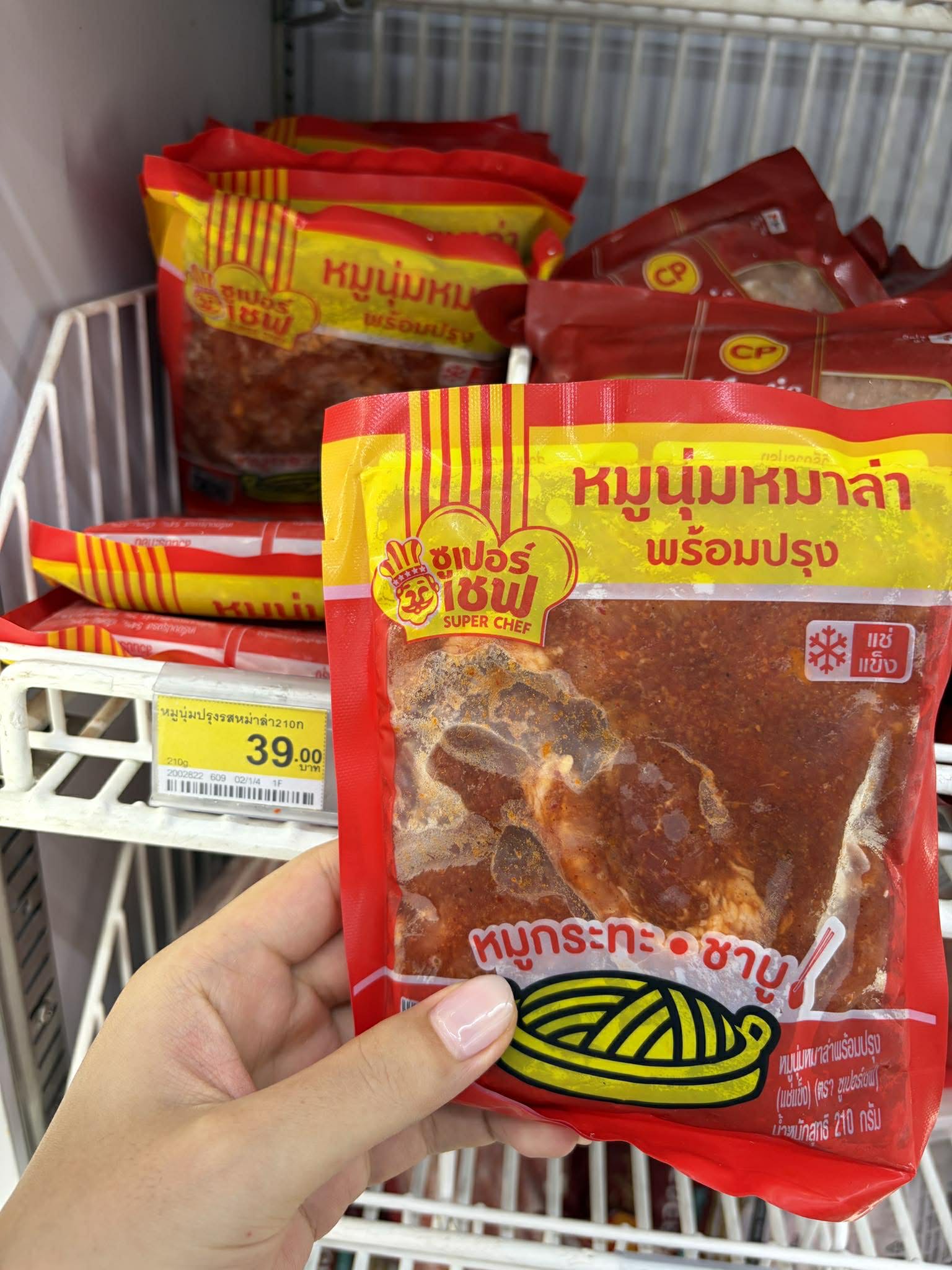 สวัสดีค่ะ มือเย็นวันนี้ ไม่รู้จะกินอะไรดี เบื่ออาหารตามสั่ง เบื่ออาหารอีสาน ที่กินมาตลอดหนึ่งสัปดาห์ เลยมาเดินดูอะไรกินเล่นใน 7-11 สาขาใกล้บ้าน แล้วพบกับ หมูนุ่มหม่าล่าพร้อมปรุง ซุปเปอร์เชฟ เป็นผลิตภัณฑ์อาหารแช่แข็ง ราคา 39 บาท ฉันก็เลยอยากจะทำเมนูลวกจิ้มๆ ได้ฟีลชาบูหม่าล่ากิน เพราะว่าเราจะไม่กินข้าว หรืออะไรอย่างอื่น ฉันจึงกินแค่หม่าล่านี้ 2 ถุง ซึ่งราคารวมก็ประมาณ 80 บาทเอง ได้เนื้อเน้นๆ เลยค่ะ