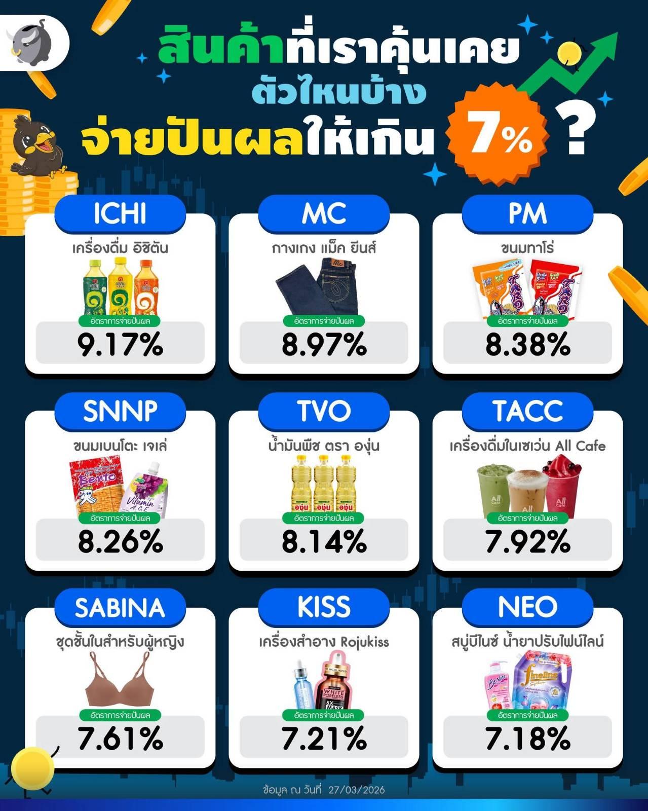 หลายคนอาจไม่รู้ว่า สินค้าที่เราเห็นอยู่รอบตัว ไม่ว่าจะเป็นชาเขียว ขนมขบเคี้ยว กาแฟในร้านสะดวกซื้อ หรือแม้แต่ชุดชั้นใน ล้วนมีบริษัทจดทะเบียนอยู่ในตลาดหุ้น และบางบริษัทก็จ่ายปันผลสูงเกิน 7% ต่อปีด้วยนะฮะ