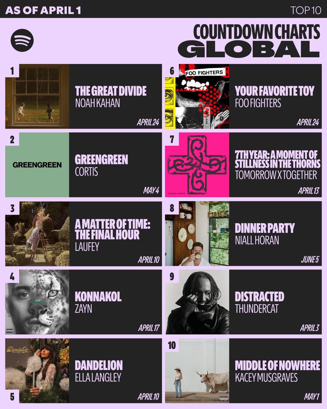 อัลบั้มคัมแบ็ค "GREENGREEN" ของ CORTIS เปิดตัวที่อันดับ 8 บนชาร์ต Spotify Global Countdown Chart ด้วยยอดพรีเซฟ 243,212 ครั้ง วงจากเจนเนอเรชั่นที่ 5 เพียงวงเดียวที่ติดท็อป 10 ใน Spotify Pre