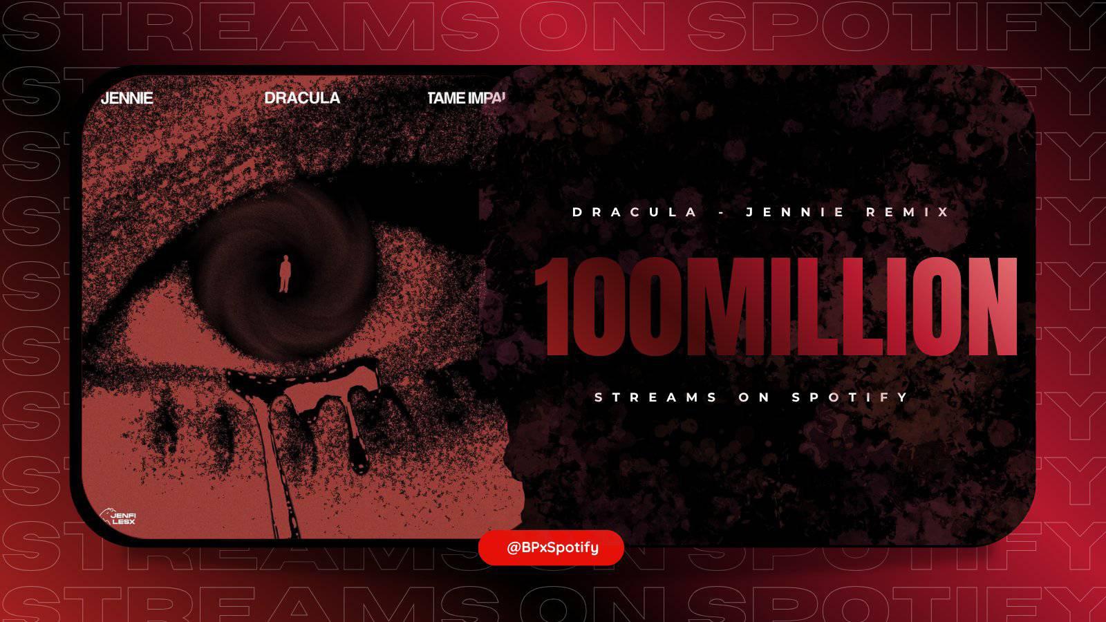 “Dracula - JENNIE Remix” 🧛♀️ กลายเป็นเพลงที่ 12 ของ JENNIE ที่มียอดสตรีมทะลุ 100 ล้านครั้งบน Spotify 🥳