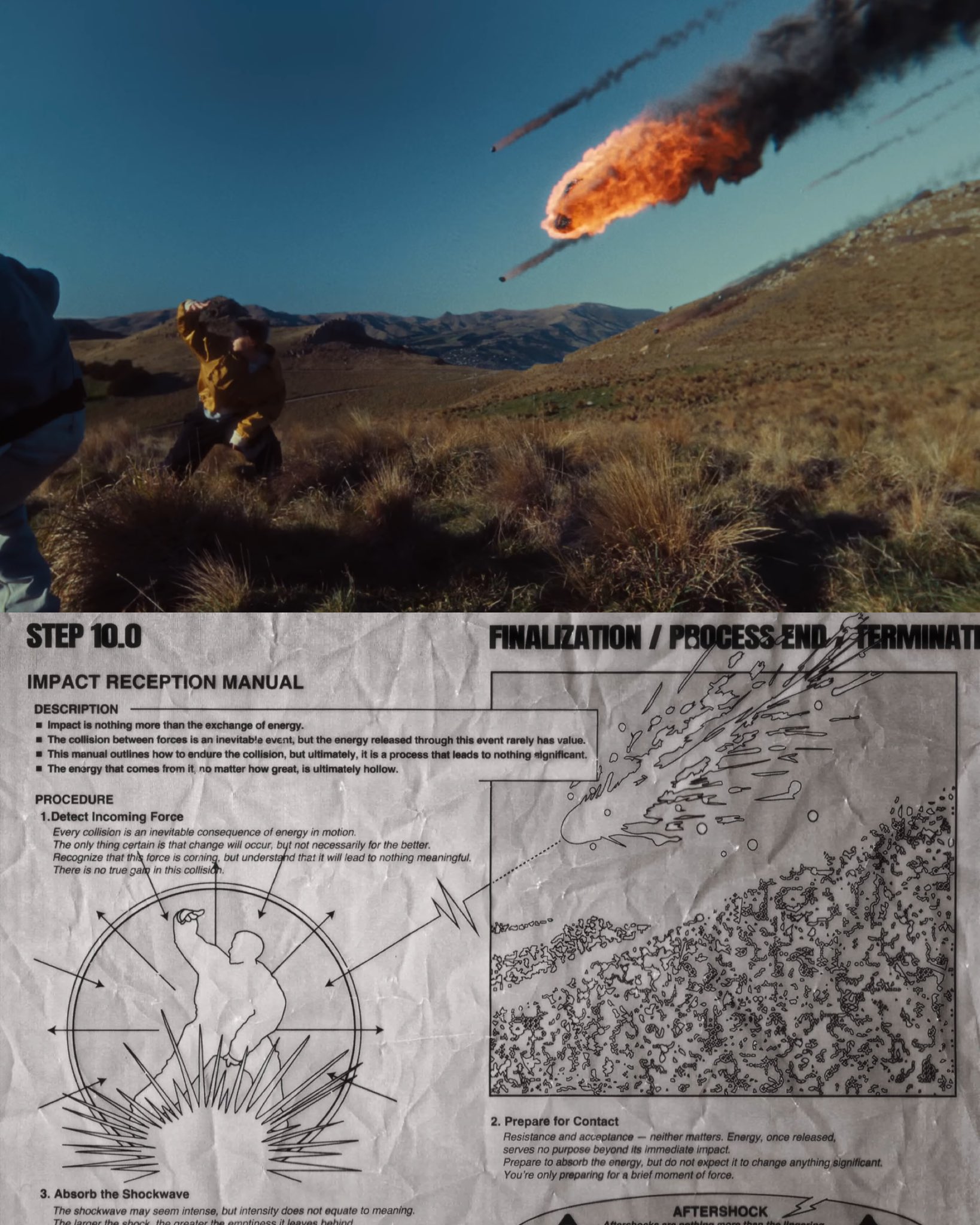 การซึมซับและคงอยู่ (Absorb & Endure): ภาพไดอะแกรมวงกลมล้อมรอบตัวคนสื่อถึงการสร้าง "เกราะป้องกันทางจิตวิญญาณ" เพื่อซึมซับแรงกระแทก (Shockwave) และอยู่รอดผ่านอาฟเตอร์ช็อก (Aftershock) ที่จะตามมา เพื่อให้แน่ใจว่าเมื่อฝุ่นตลบลงแล้ว ตัวตนที่แท้จริงของพวกเขายังคงยืนหยัดอยู่ได้อย่างมั่นคง
