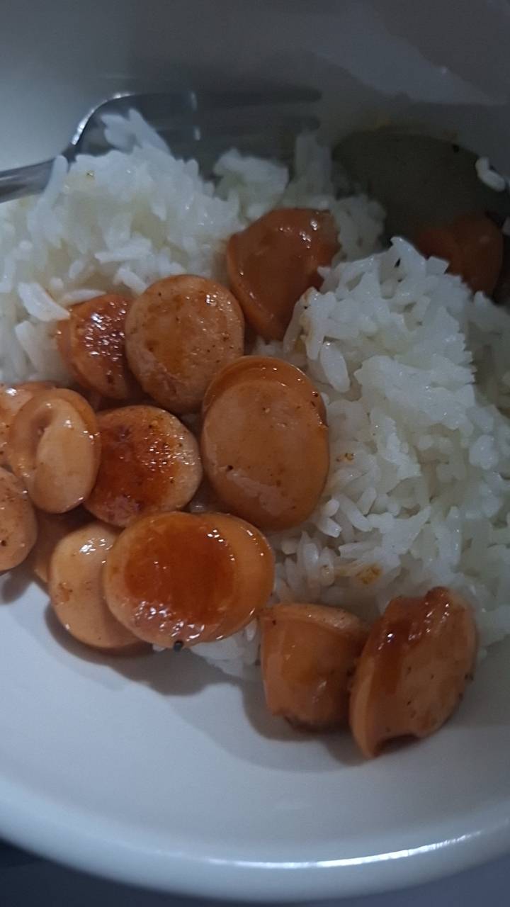 ใส้กรอกไก่สองแท่ง ผัดซอสญ่ปุ่น ราดข้าว มื้อเช้า ของเหลือจากตู้เย็น