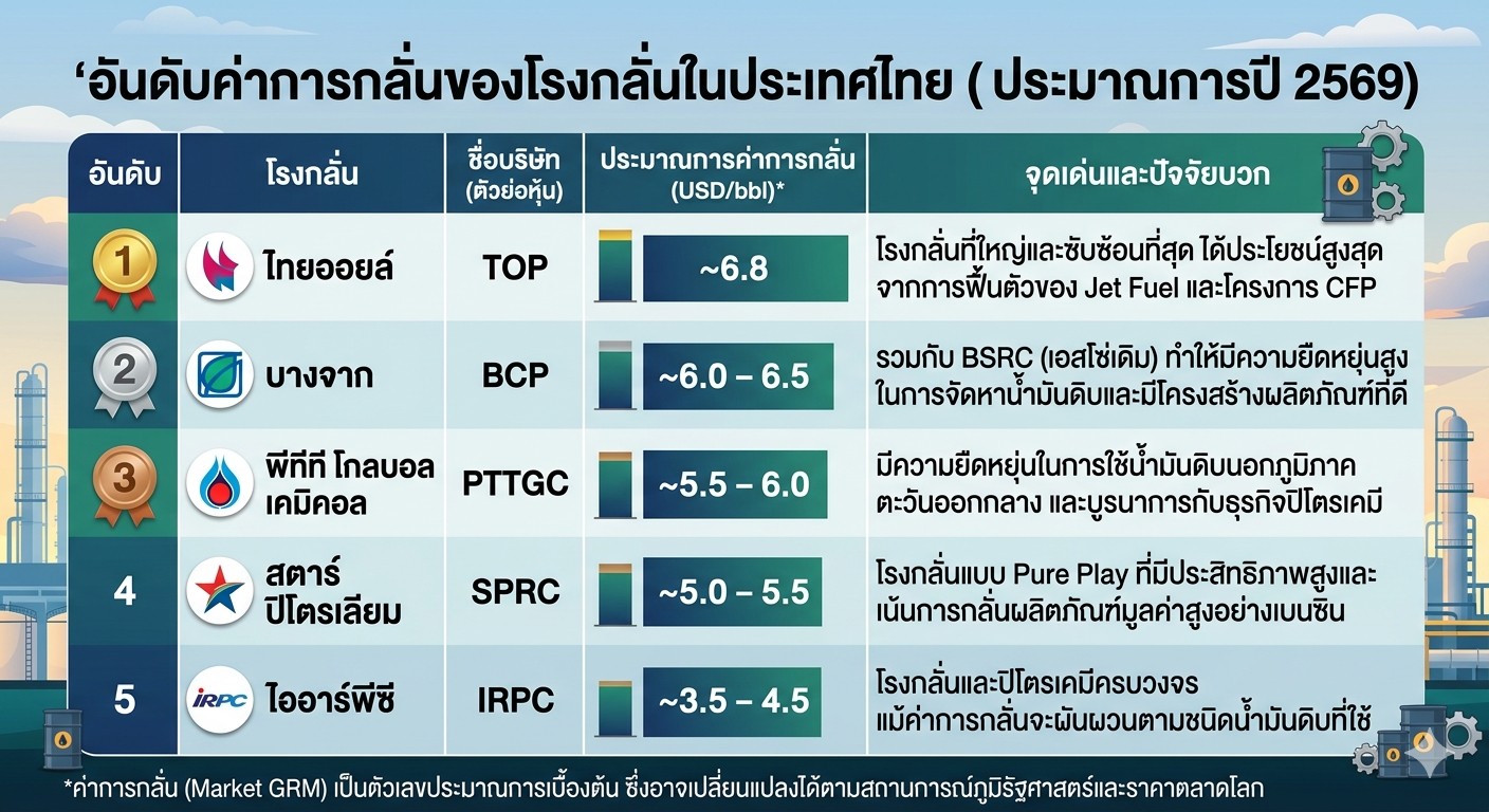 ต้นปี 2569 ค่าการกลั่นมีแนวโน้มฟื้นตัวจากความต้องการน้ำมันดีเซลและน้ำมันเครื่องบินที่เพิ่มสูงขึ้น โดยนี่คือการจัดอันดับโดยประมาณการจากผลการดำเนินงานและศักยภาพของโรงกลั่นหลัก 5 แห่งในไทย: