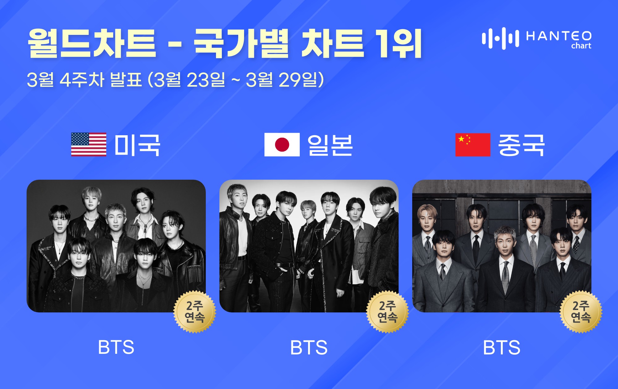 วง BTS กลับมาครองอันดับหนึ่งในทุกหมวดหมู่ของชาร์ตเพลง Hanteo อีกครั้ง โดย.ชาร์ต Hanteo ซึ่งเป็นชาร์ตเพลงแบบเรียลไทม์เพียงแห่งเดียวในโลก ได้ประกาศรายชื่อ 30 อันดับแรกของชาร์ตเพลงประเทศสหรัฐอเมริกา ญี่ปุ่น และจีน สำหรับสัปดาห์ที่ 4 ของเดือนมีนาคม (นับช่วงเวลาตั้งแต่วันที่ 23 มีนาคมถึง 29 มีนาคม) ในเช้าวันที่ 3 เมษายน