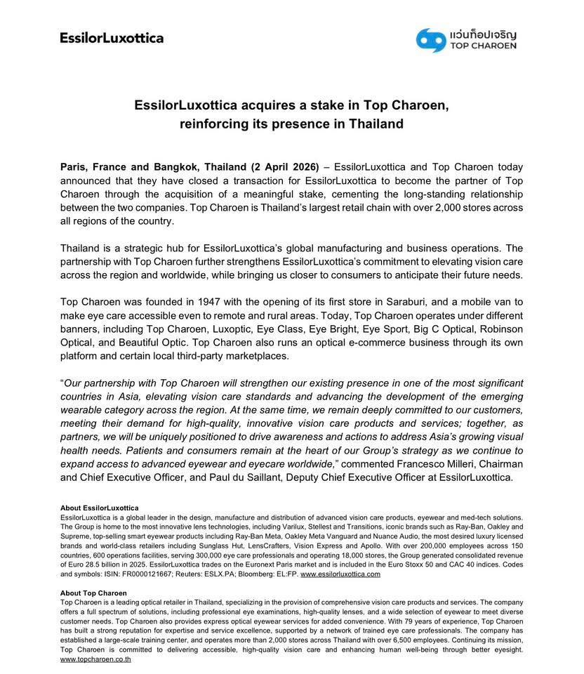 -ล่าสุด EssilorLuxottica บริษัทระดับโลก เจ้าของแว่นตา Ray-Ban, Oakley ประกาศเข้าถือหุ้นในสัดส่วนที่มีนัยสำคัญใน “ท็อปเจริญ”