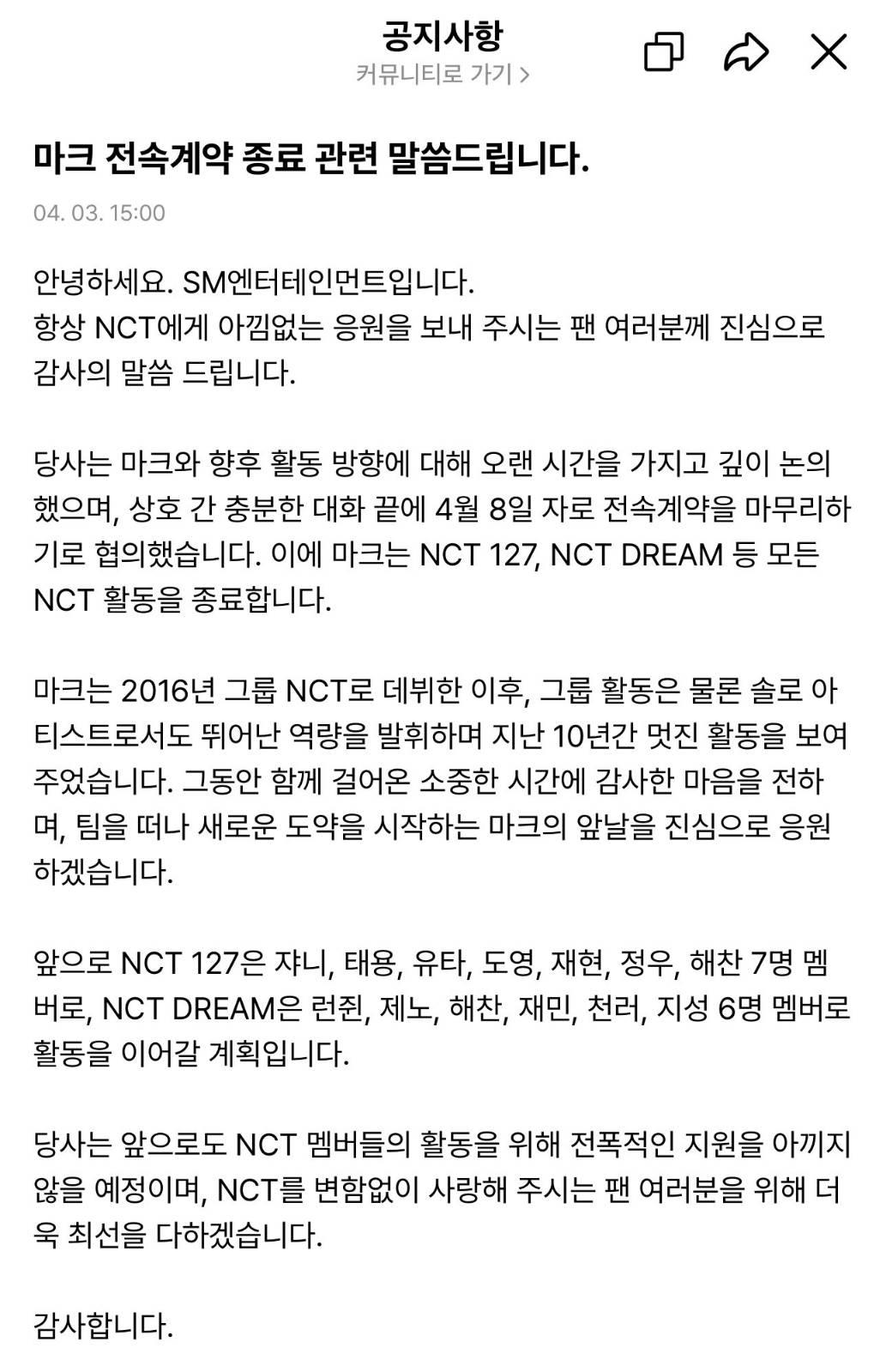 หลังจากผ่านการพูดคุยอย่างรอบคอบและถี่ถ้วนกับมาร์คเกี่ยวกับกิจกรรมในอนาคตของเขามาเป็นระยะเวลานาน เราได้บรรลุข้อตกลงร่วมกันที่จะยุติสัญญาพิเศษของเขาในวันที่ 8 เมษายนนี้ โดยมาร์คจะยุติการทำกิจกรรมทั้งหมดในฐานะสมาชิกของวง NCT ซึ่งรวมถึง NCT 127 และ NCT DREAM