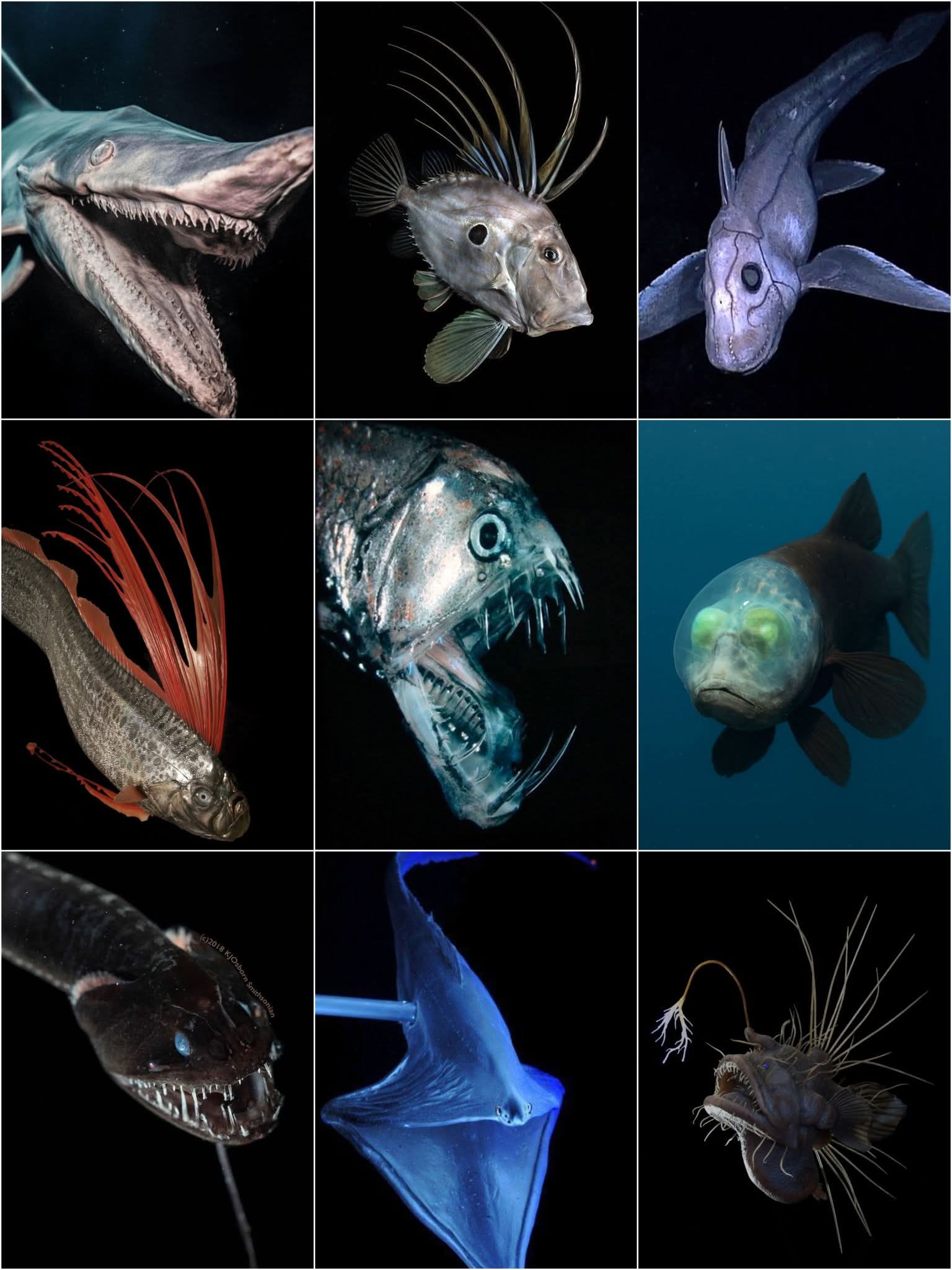 ปลาบางชนิดมีดวงตาขนาดมหึมาเพื่อเก็บเกี่ยวแสงที่เหลืออยู่น้อยนิดให้ได้มากที่สุด ในขณะที่บางชนิดตาบอดสนิทแต่ใช้ประสาทสัมผัสอื่นแทน
