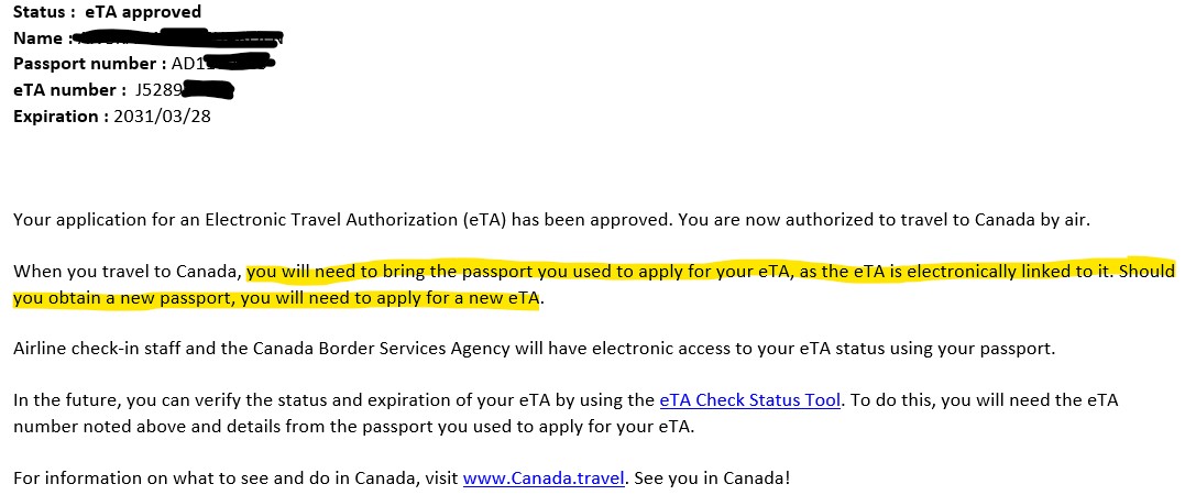 กรอกเลขพาสปอร์ตปัจจุบันถูกต้องแล้วค่ะ เพราะ eTA จะผูกกับเล่มที่ใช้เดินทางไปแคนาดานะคะ