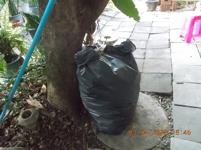 กิ่งที่ตัดลงมา ก็มานั่งสับๆๆๆๆเป็นชิ้นเล็กๆ ใส่ถุงดำ เทศบาลมาเก็บไป