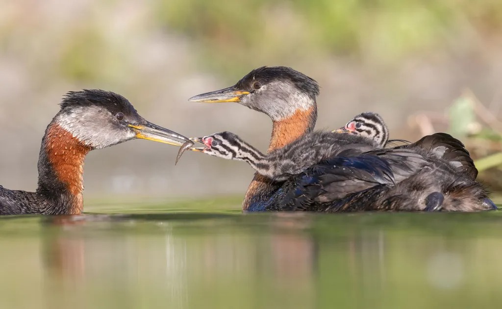 นกเป็ดน้ำคอแดง ป้อนลูกปลา ให้ลูกนก