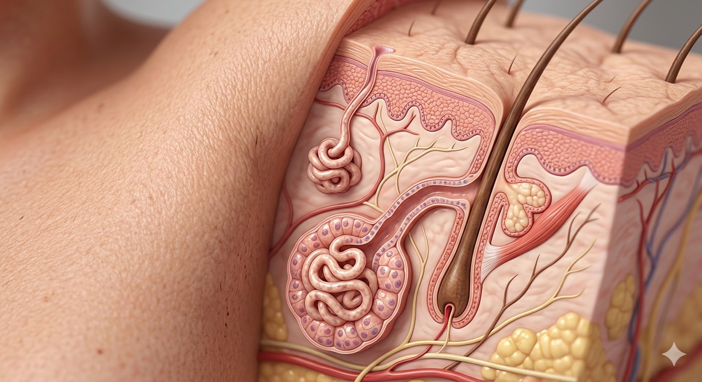 ต่อมอะโพไครน์ (Apocrine): นี่คือตัวแสบ! อยู่เฉพาะจุดที่มีขนเยอะ เช่น รักแร้ และขาหนีบ เหงื่อจากต่อมนี้จะมีความเข้มข้นสูง มีโปรตีนและไขมันเยอะ ซึ่งเป็น "บุฟเฟต์ชั้นดี" ของแบคทีเรีย ยิ่งเหงื่อออกตรงนี้เยอะ กลิ่นก็ยิ่งแรงครับ