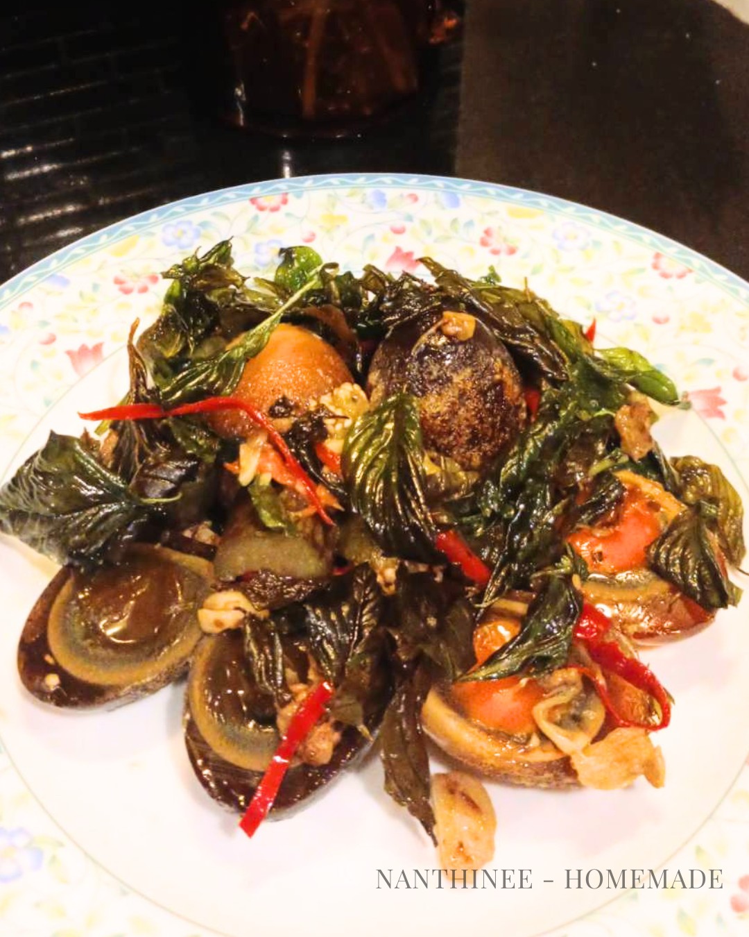 - ปิดท้ายด้วยใบโหระพา ผัดให้เข้ากัน ปิดเตา ตักราดบนไข่เยี่ยวม้า