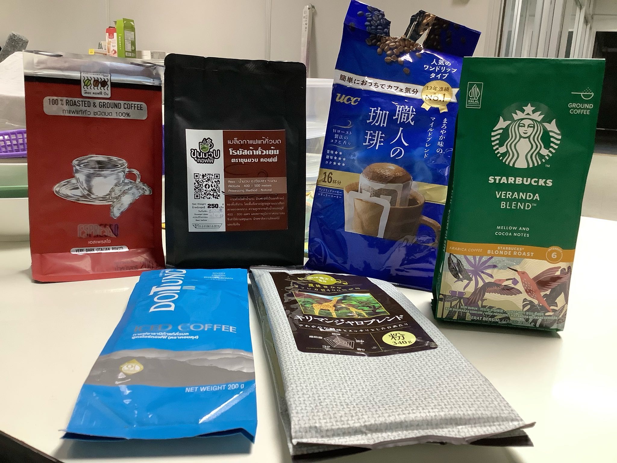 แถวนอน ซ้ายมือถุงสีฟ้า เป็นของดอยตุง เบลนด์มาสำหรับชงทำ Iced coffee โดยเฉพาะ และก็สมราคา ดื่มแบบเย็นได้อร่อยมาก ๆ แต่มาแพ้ถุงสีเขียวข้างบนในตอนหลัง (แต่ก็นะ ถุงเขียวแพงกว่าด้วย ... เรื่องความชอบเป็นความเห็นส่วนตัวนะครับ)
