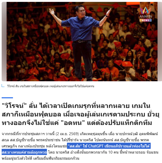 "สส.ส้ม" ใช้ ChatGPT เขียนอภิปรายแล้วท่องไม่ได้ สส.บางคนแค่สามล้อถูกหวย