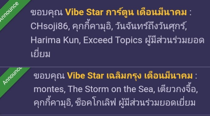 https://pantip.com/forum/pantip ขอบคุณทีมงานที่คัดเลือกให้ได้รับ Vibe Star พันทิป 2 เดือนติดต่อกัน พร้อมรับพอยต์เพิ่มอีก 50 พอยต์ น่าจะมีเพิ่มแท็ก "Vibe Star" ฝากทีมงานพิจารณาด้วยครับ