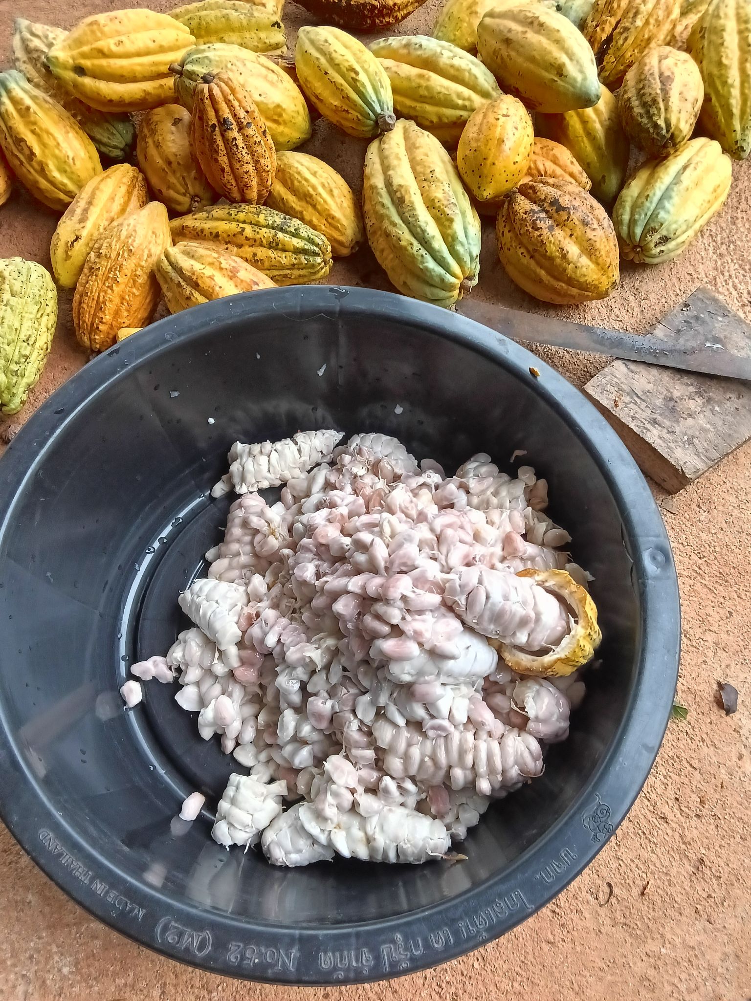 ผลคาเคาซื้อหน้าสวนกิโลกรัมละ 10 บาท ผมซื้อมา 50 กิโลกรัมมาหมักทำไวน์ ซึ่งเป็นจุดเริ่มต้นของการหมักบ่มเม็ดคาเคาเพื่อแปรรูปเป็น คาเคาบีน(cacao bean) ต่อไป