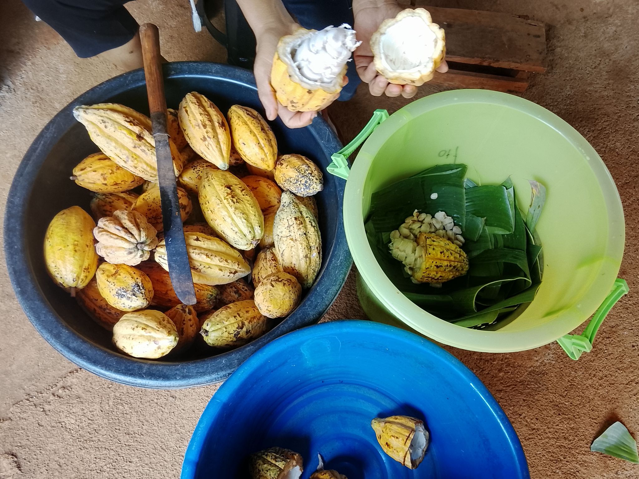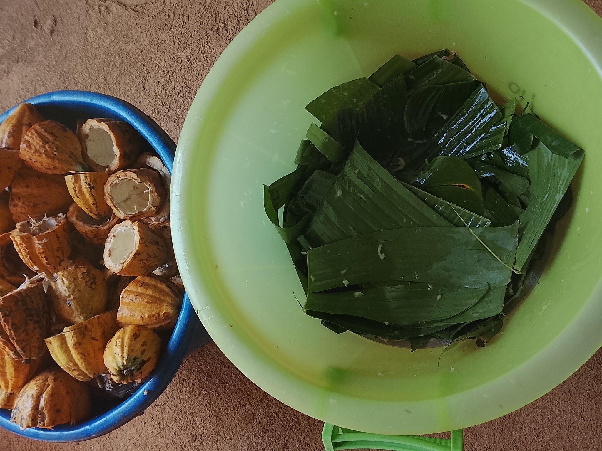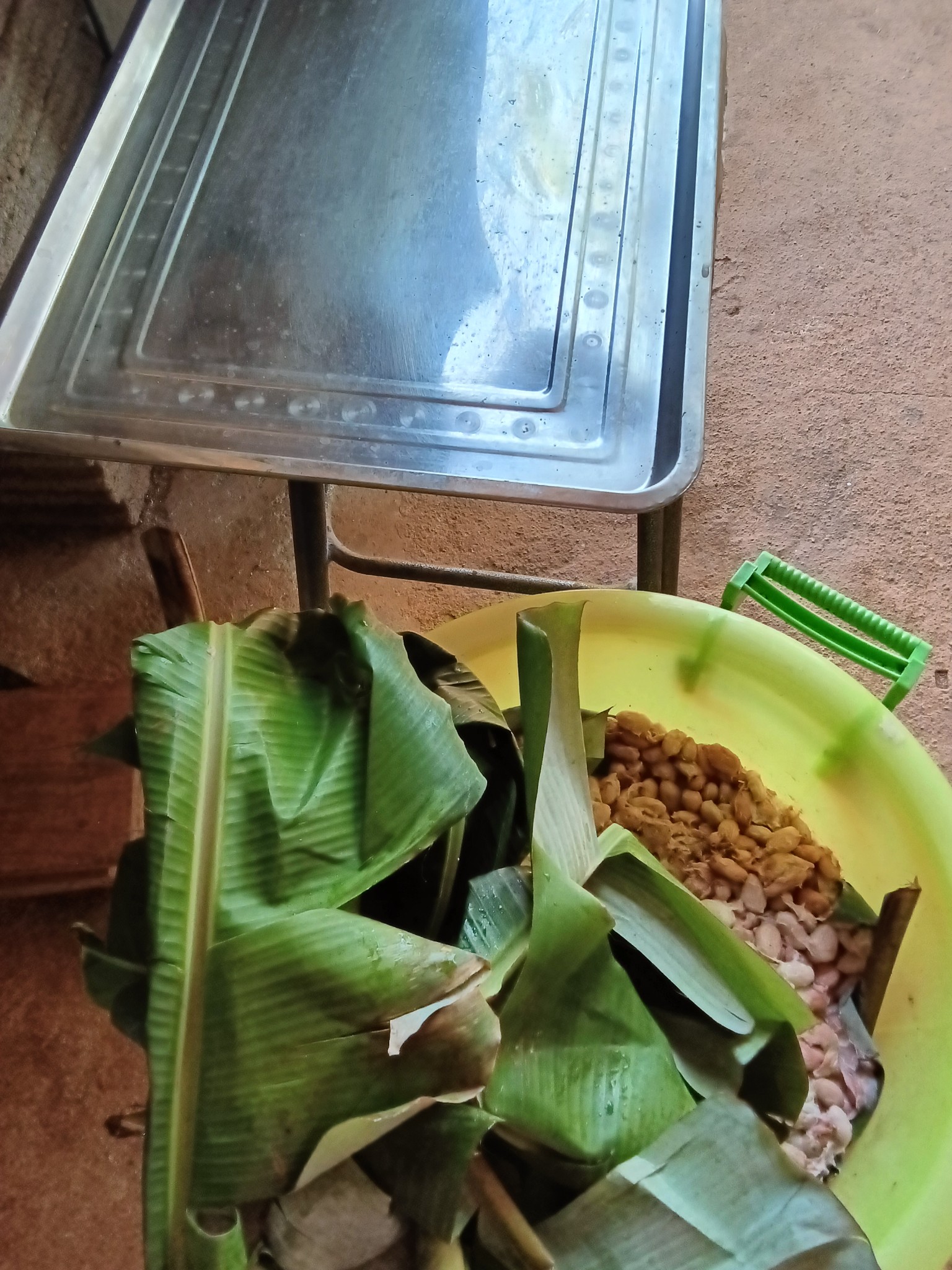 2. ห่อหุ้มบุภายในถังหมักด้วยใบกล้วยให้เกิดยีสต์ธรรมชาติ ย่อยเยื่อฟองน้ำหุ้มเมล็ดคาเคาให้เป็นไวน์ห่อปิดทับด้วยใบกล้วยหลายๆ ชั้นให้อบในอุณหภูมิ 40-50 C ปิดฝาถังพอป้องกันการรบกวนจากปัจจัยภายนอก