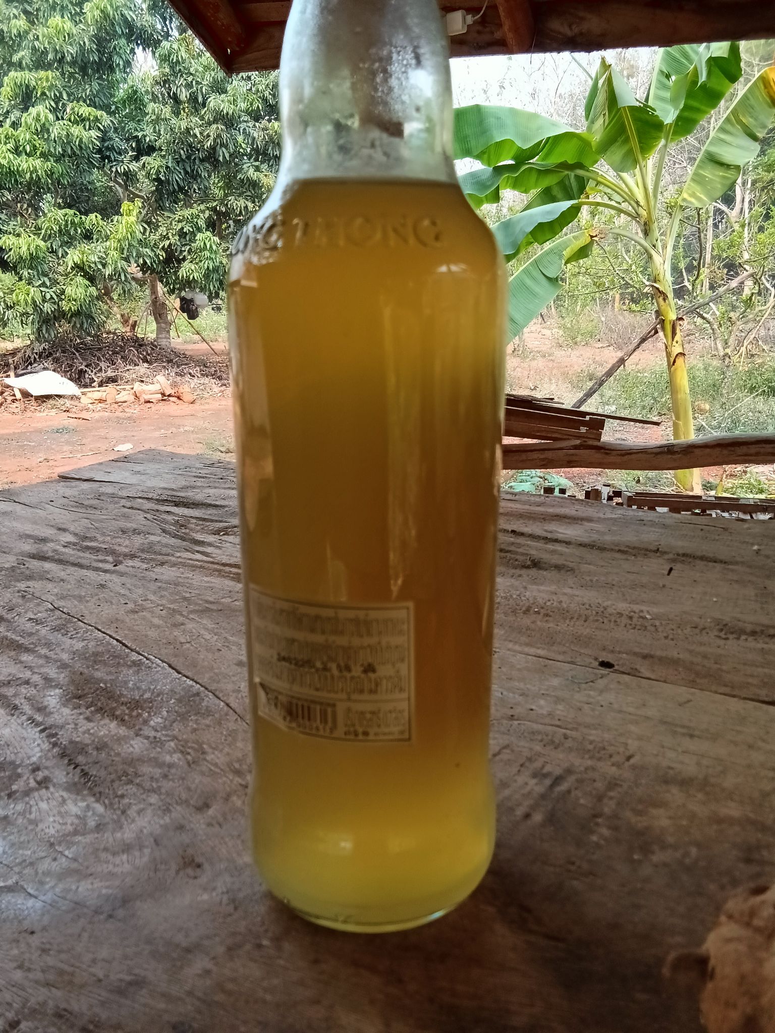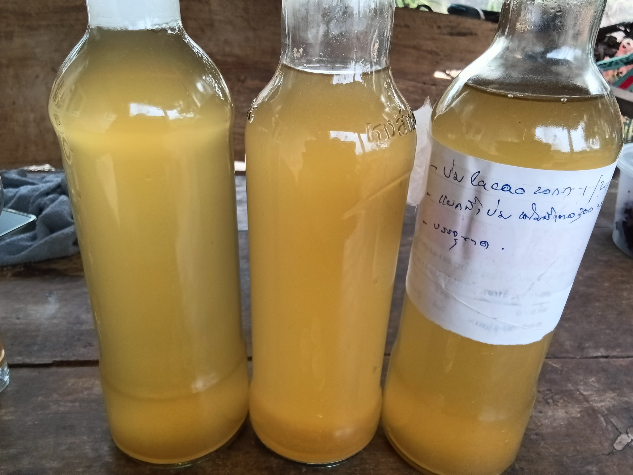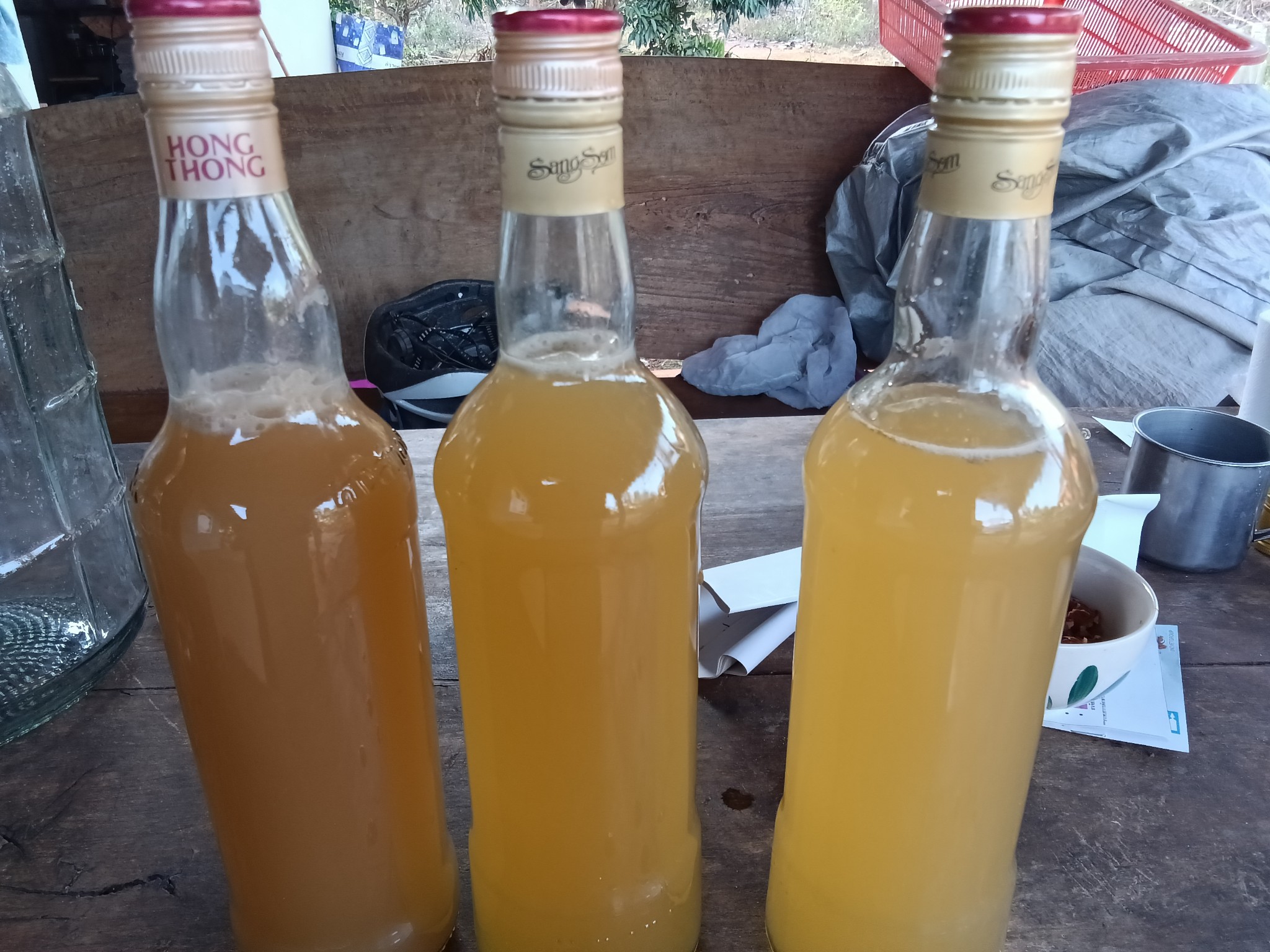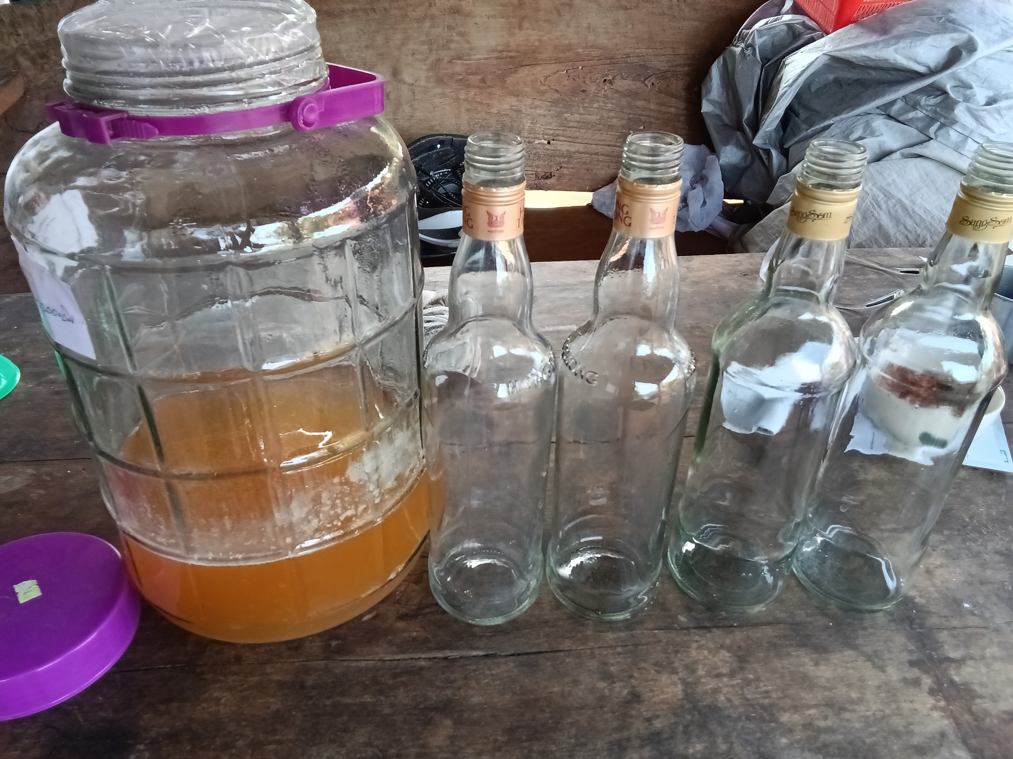 6. ถ่ายลงขวดแก้ว เพื่อรอให้ตกตะกอนปิดจุกให้แน่น ทิ้งไว้ใต้ถุนบ้านเย็นๆ ทิ้งลืมเลยก็ได้ ถ้าเห็นใสพอแล้วหรืออดใจไม่ไหว ก็อาจรินเปลี่ยนขวดทิ้งกากขุ่น แช่ตู้เย็นดื่มชื่นใจ ถ้าตะขิดตะขวงใจเอาไปนึ่งฆ่าเชื้อระแวงก่อนก็ได้