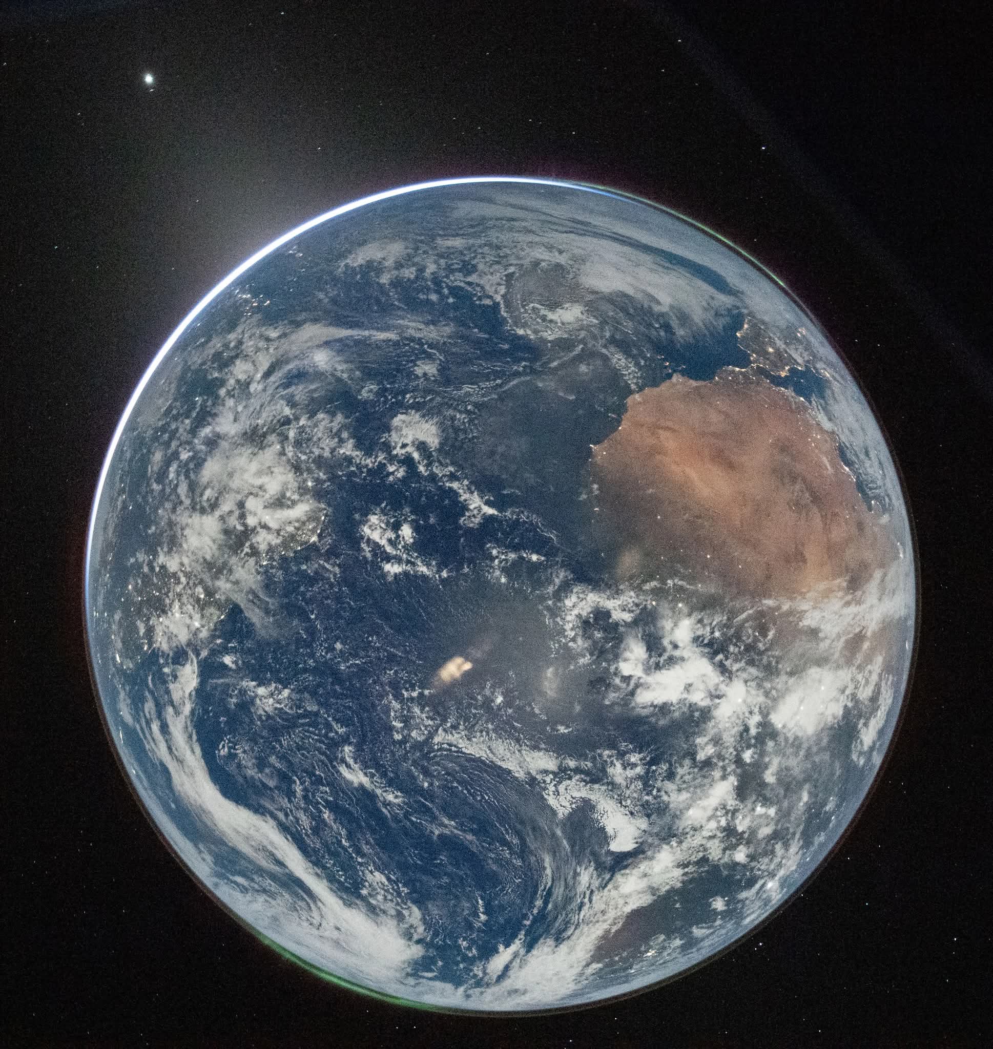 ส่วนแหล่งกำเนิดแสงที่ทำให้มองเห็นโลกได้นั้น ก็มาจากจันทร์เกือบเต็มดวง ที่นักบินอวกาศกำลังเดินทางไปบินผ่านอยู่นั่นเอง