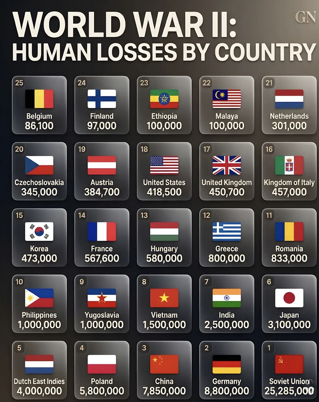 Top 25 ชาติที่คนตายมากสุดใน World War 2 (1939~1945)