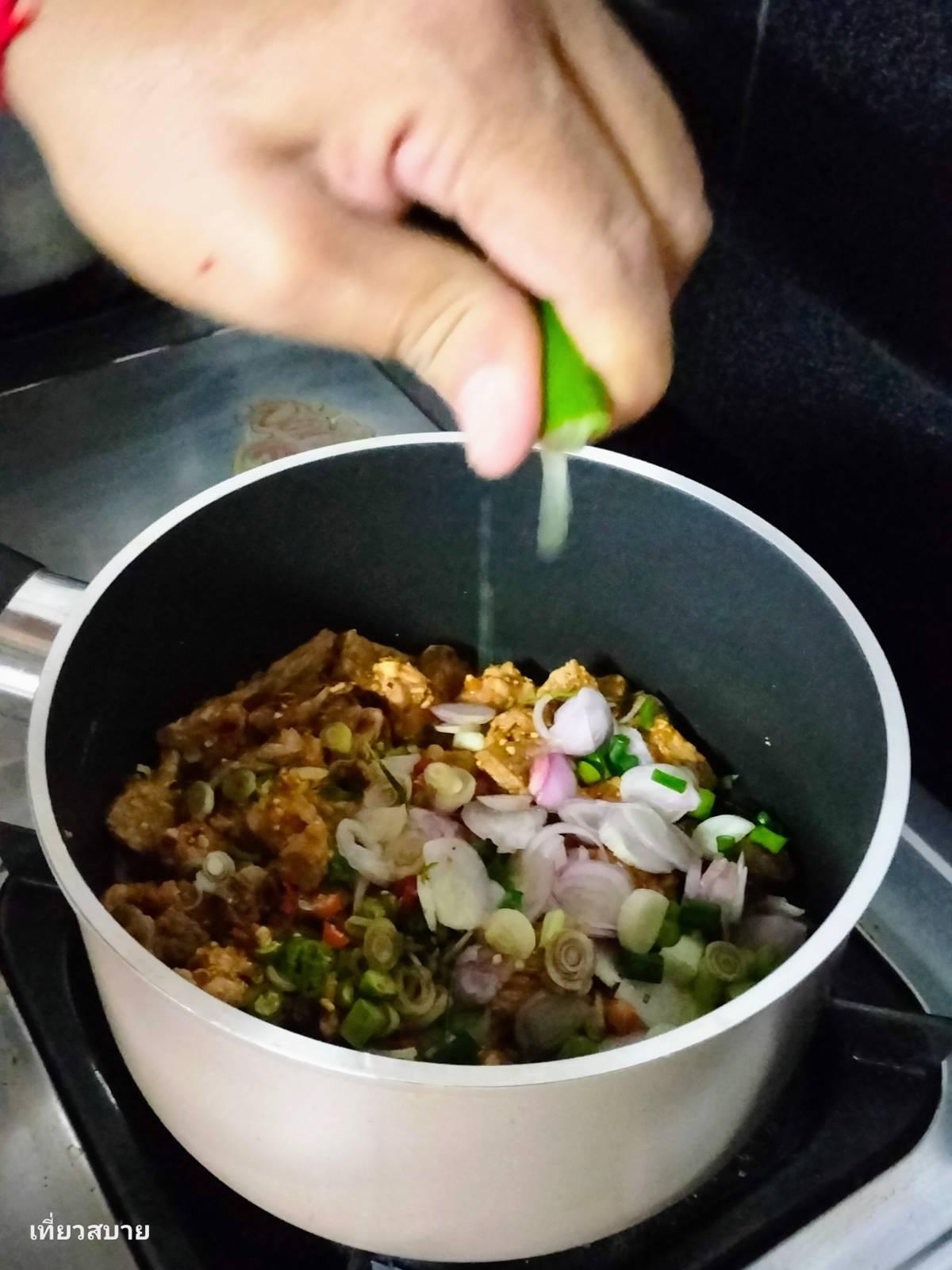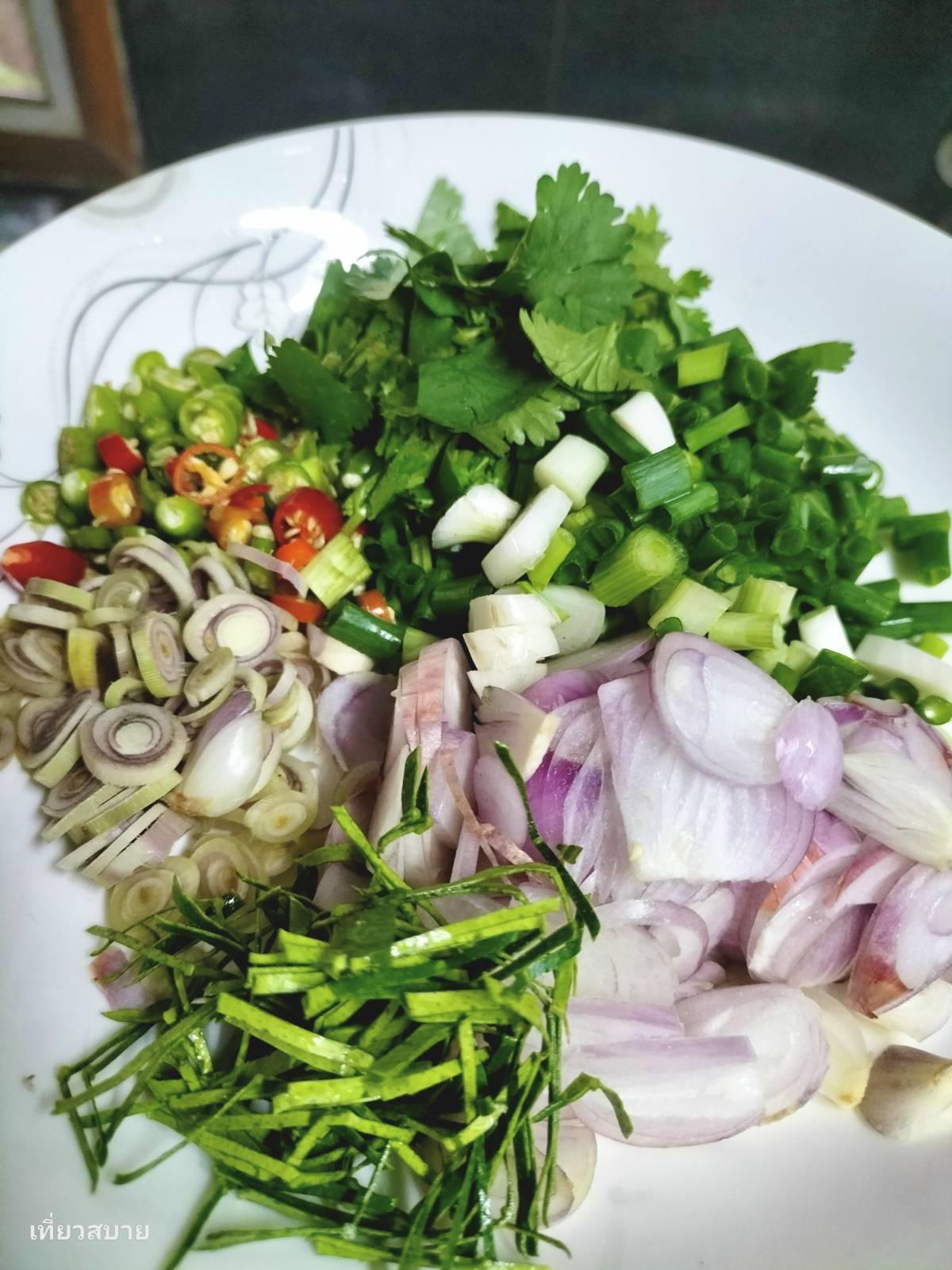 3. ใส่หอมแดงซอย ตะไคร้ซอย พริกขี้หนูซอย คลุกเคล้าให้เข้ากัน