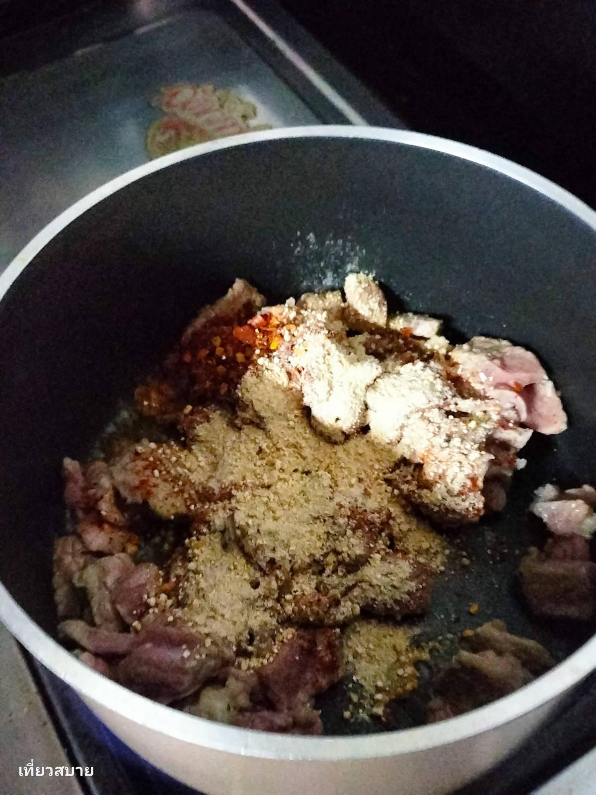 2. ใส่พริกป่นและข้าวคั่วลงไปคลุกเคล้ากับเนื้อที่รวนไว้