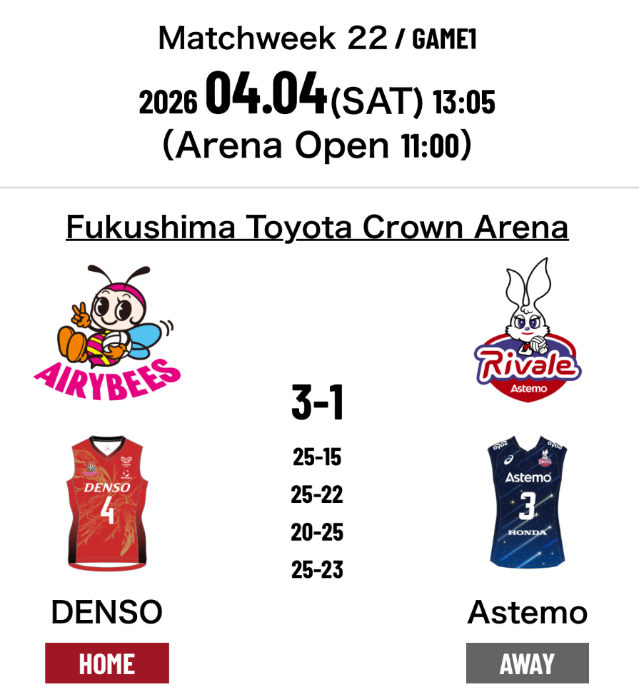 1.Denso Airybees 3-1 Astemo Rivale Ibaraki (25-15 25-22 20-25 25-23)
