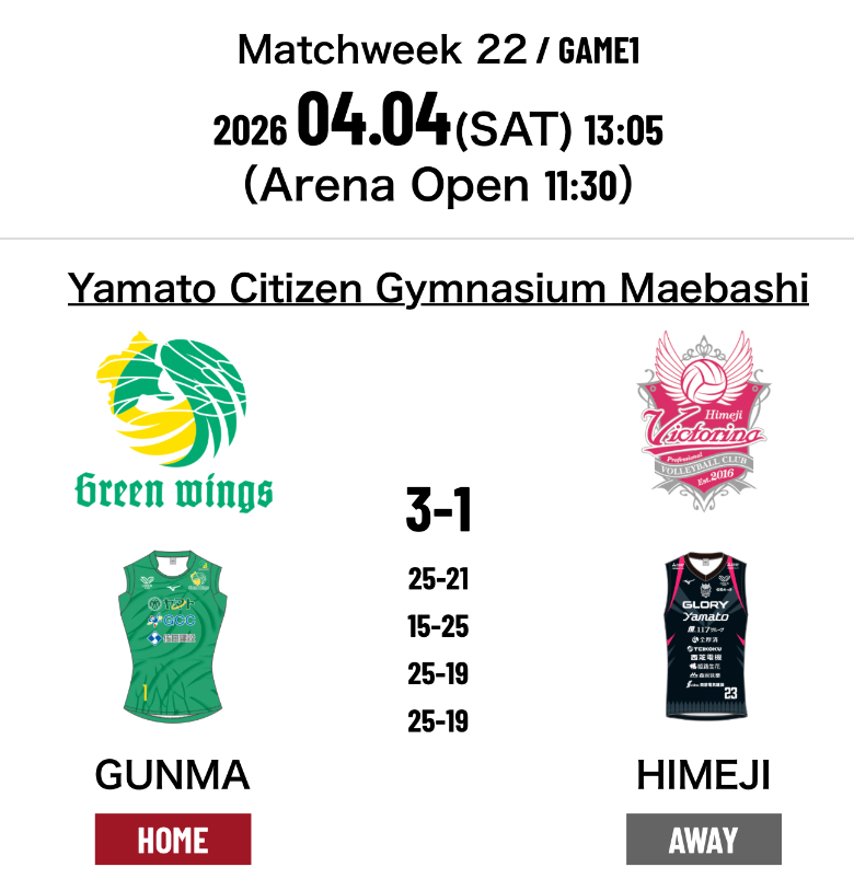 2.Gunma Bank Green Wings 3-1 Victorina Himeji (25-21 15-25 25-19 25-19)