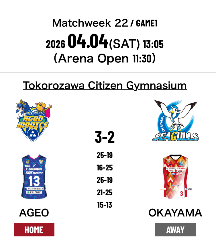 3.Saitama Ageo Medics 3-2 Okayama Seagulls (25-19 16-25 25-19 21-25 15-13)