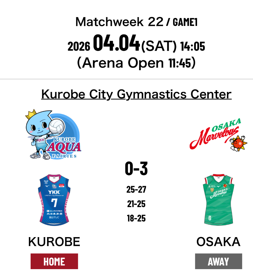 4.Kurobe Aqua Fairies 0-3 Osaka Marvelous (25-27 21-25 18-25)