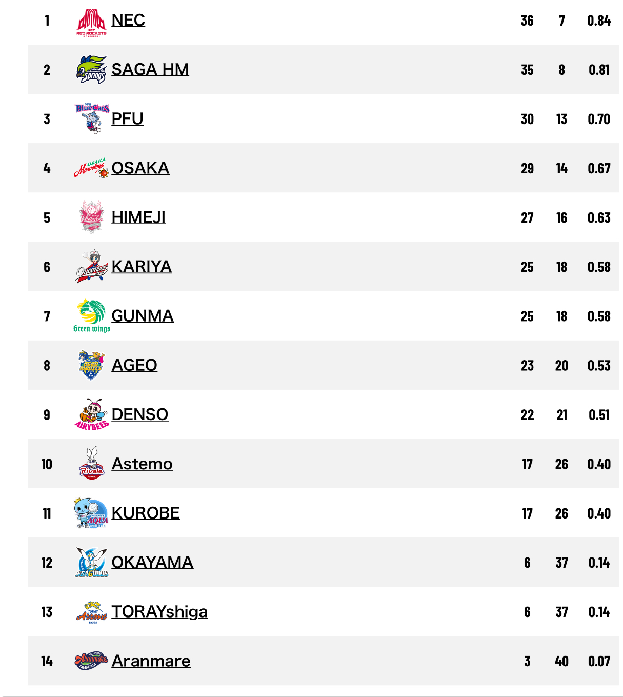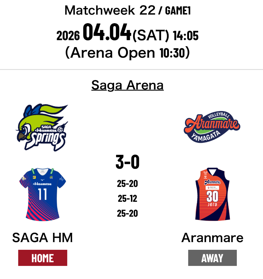 6.SAGA Hisamitsu Springs 3-0 Aranmare Yamagata (25-20 25-12 25-20)