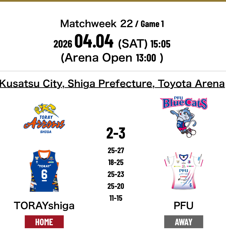 7.Toray Arrows Shiga 2-3 PFU Blue Cats Ishikawa Kahoku (25-27 18-25 25-23 25-20 11-15)