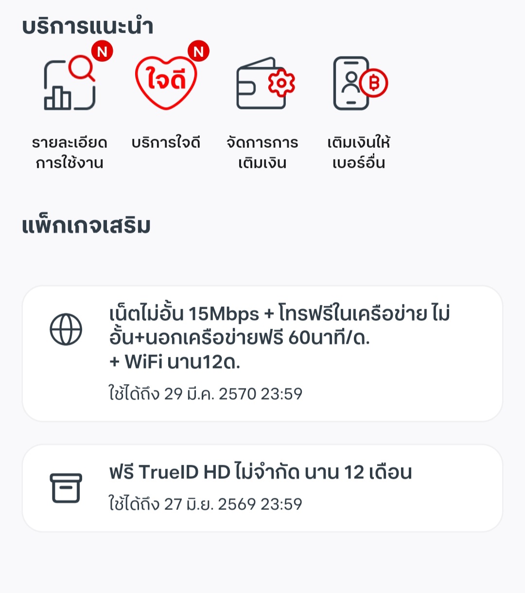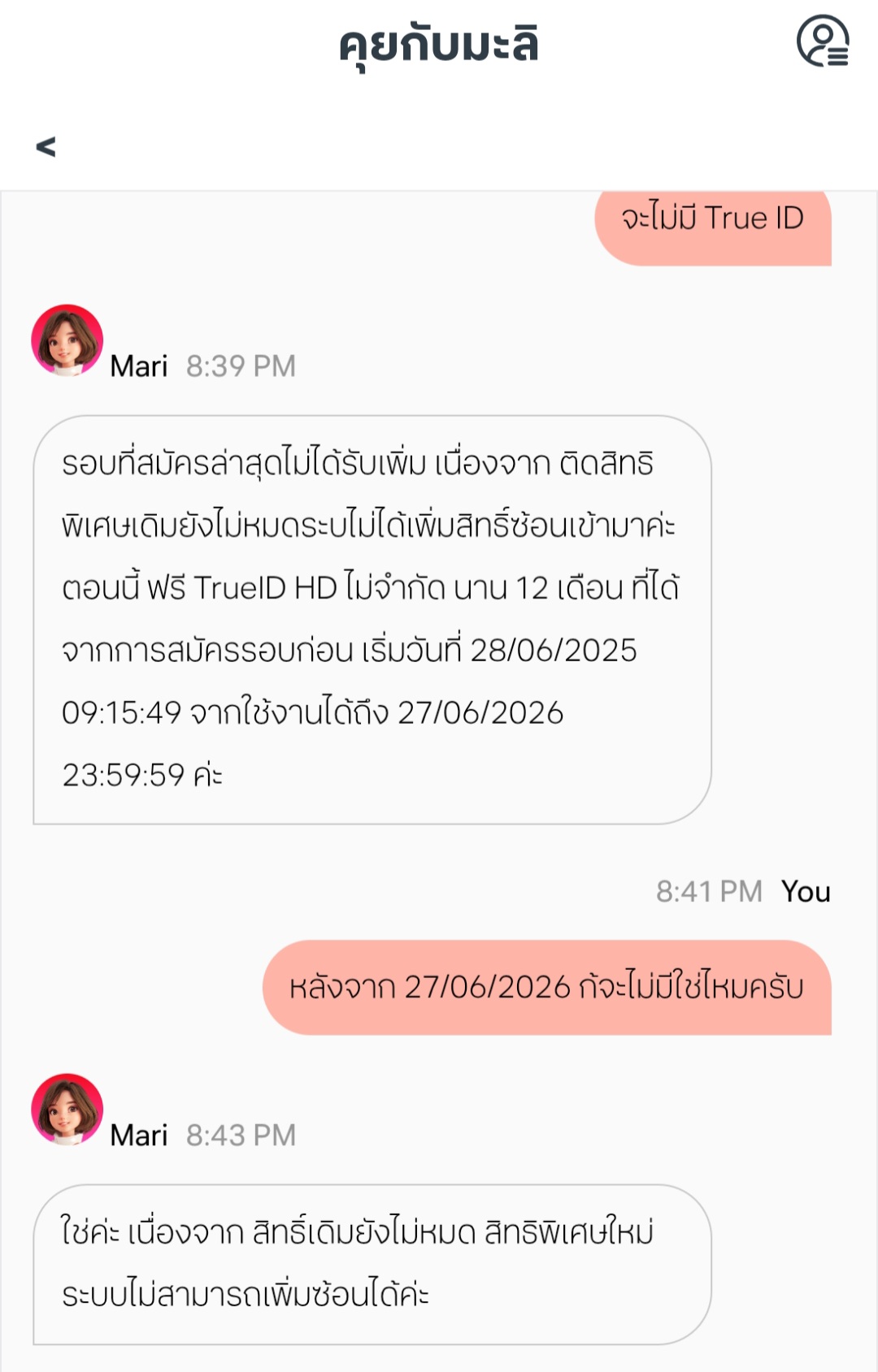ตอนแรกผมใช้แพ็กเกจ เน็ตไม่อั้น15Mbps + True ID ไม่อั้น + โทรฟรีในเครือข่ายไม่อั้น+เบอร์อื่นฟรี60นาที/30วัน + WiFi นาน12รอบ โดยปกติแล้วแพ็กเกจจะหมดอายุ เดือนมิถุนายน 2026 แต่ผมสมัครแพ็กเกจใหม่ก่อนหมดอายุ 2 เดือน คือ เดือนเมษา 2026 ซึ่งก็ได้แพ็กเกจใหม่เน็ตไม่อั้น15Mbpsไม่อั้น + โทรฟรีในเครือข่ายไม่อั้น+เบอร์อื่นฟรี60นาที/30วัน + WiFi นาน12รอบ หมดอายุเดือนมีนาคม 2027 แต่ไม่มี True ID มาให้ จึงสอบถามไปทางพนักงานในแอพ True ทาง True แจ้งว่า แพ็กเกจเดิมยังไม่หมดอายุ จึงเพิ่มแพ็กเกจใหม่ให้ไม่ได้ จึงอยากรู้ว่ามีแบบนี้ด้วยหรอ แต่เน็ตเพิ่มให้ได้