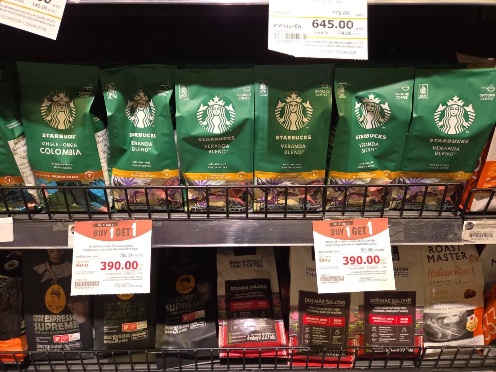 ปกติเปลี่ยนกาแฟไปเรื่อย ช่วงนี้ starbucks ถูกเลยจัดมาบ่อยๆ ราคาป้ายที่โลตัส 390 แต่ช่วงนี้ จ่ายจริง 290-299 ราคาไม่เท่ากันแต่ละแบบ (โปรดตรวจสอบราคา ณ จุดขายอีกครั้ง) ชอบ Espresso roast, House blend
