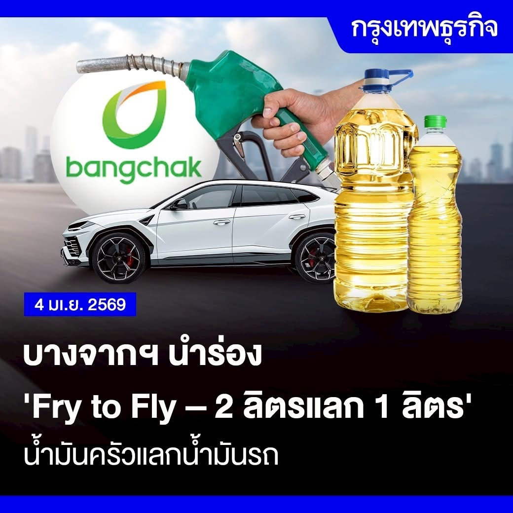 บางจากฯ นำร่อง “Fry to Fly - 2 ลิตร แลก 1 ลิตร” ให้ประชาชนนำน้ำมันปรุงอาหารใช้แล้ว 2 ลิตร มาแลกน้ำมันเชื้อเพลิงสำหรับรถยนต์ 1 ลิตร