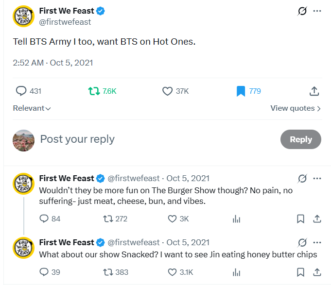 First We Feast ผู้ผลิตรายการ Hot Ones เคยโพสต์อยากให้ BTS ไปปรากฏตัวในรายการ