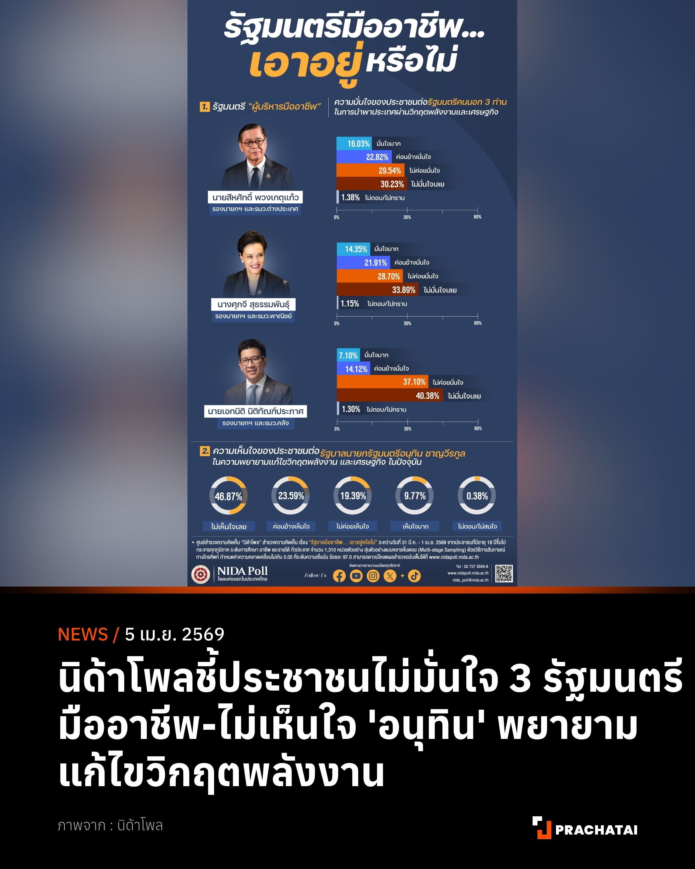 5 เมษายน 2569 ศูนย์สำรวจความคิดเห็น “นิด้าโพล” สถาบันบัณฑิตพัฒนบริหารศาสตร์ (นิด้า) สำรวจความคิดเห็น เรื่อง “รัฐมนตรีมืออาชีพ… เอาอยู่หรือไม่” ระหว่างวันที่ 31 มี.ค. - 1 เม.ย. 2569 จากประชาชนที่มีอายุ 18 ปีขึ้นไป กระจายทุกภูมิภาค ระดับการศึกษา อาชีพ และรายได้ ทั่วประเทศ 1,310 หน่วยตัวอย่าง เกี่ยวกับความคิดเห็นของประชาชนต่อความพยายามของรัฐบาลนายกรัฐมนตรีนายอนุทิน ชาญวีรกูล ในการแก้ไขวิกฤตพลังงานและเศรษฐกิจ