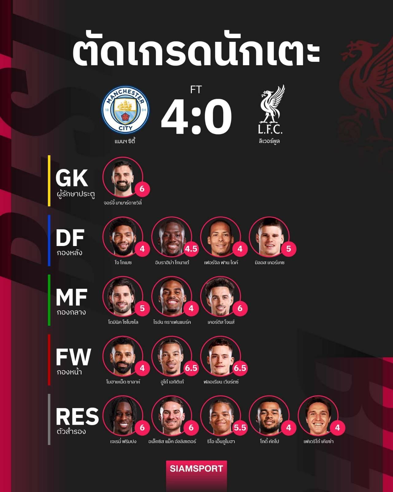 เน่าแทบยกแผง ตัดเกรดนักเตะหงส์แดงเกมบุกไปโดนแมนซิตี้ไล่ถล่มเละ 4-0 จนร่วงตกรอบเอฟเอคัพไปอย่างสุดอนาถ