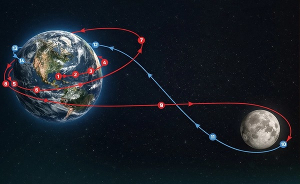 9. การเดินทาง 4 วัน (Outbound Journey) ยานจะใช้เวลาประมาณ 4 วัน บนเส้นทาง Free Return Trajectory ไปยังดวงจันทร์