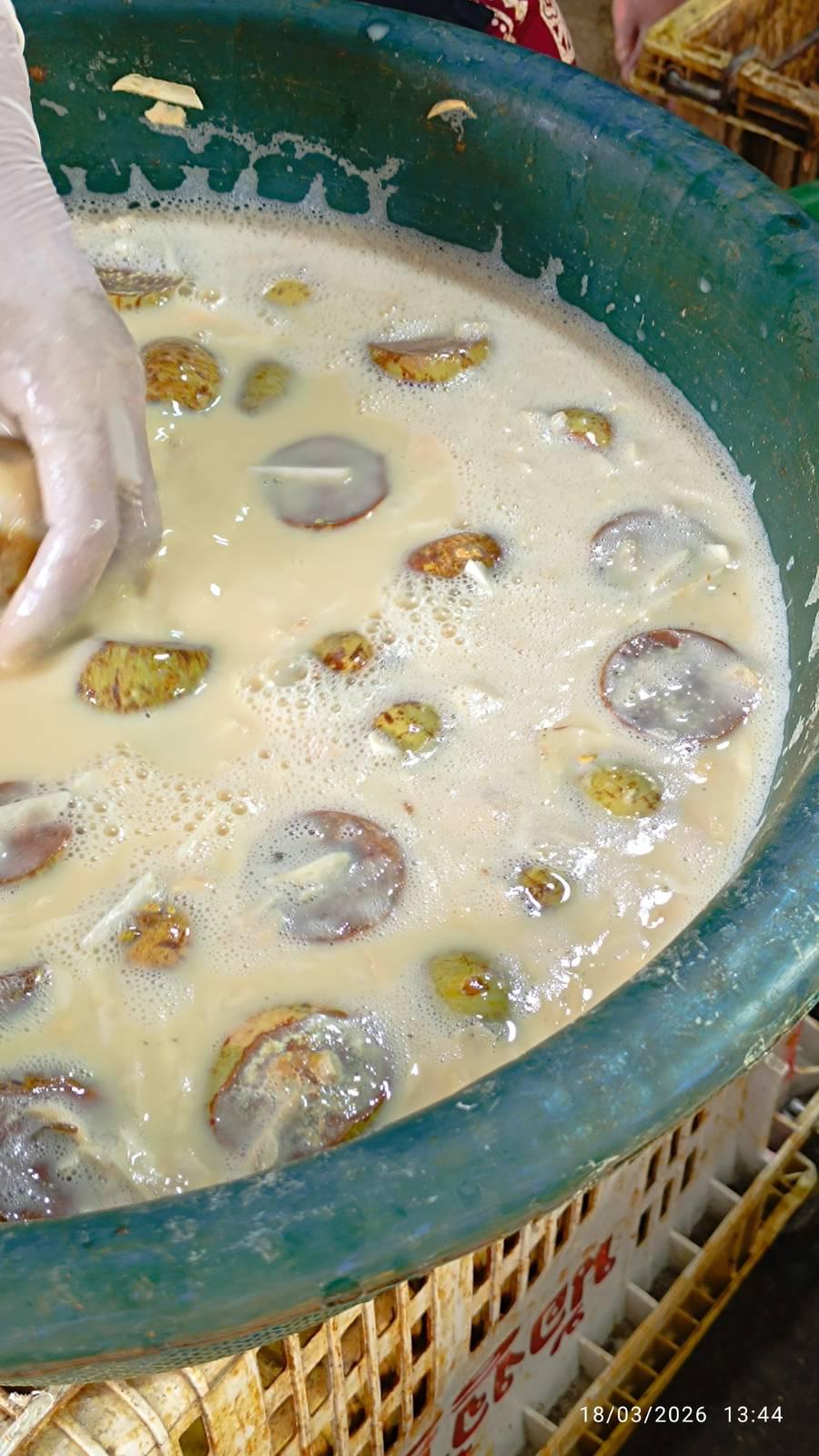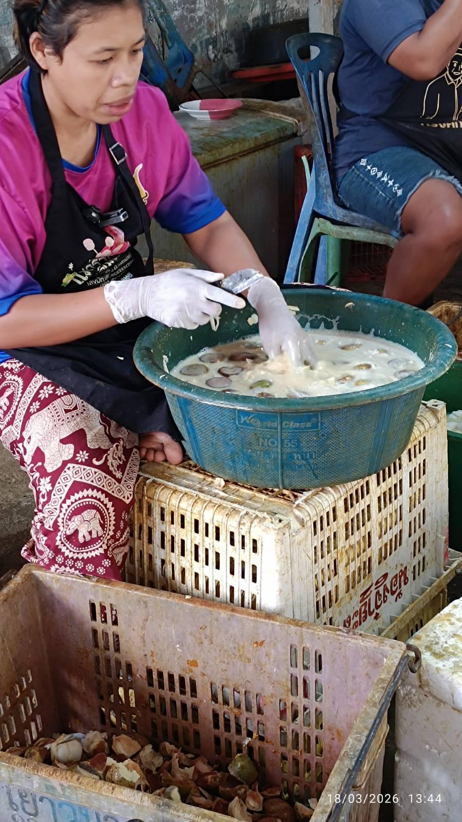 หลังจากมังคุดมาถึงร้าน จะมีการตัดจุก และแช่น้ำทิ้งไว้ ก่อนที่จะนำมาปอกเปลือกออกไป เปลือกผลนี้มีคนมารับซื้อไปใช้ประโยชน์ต่อ ไม่ได้ทิ้งแต่อย่างใด