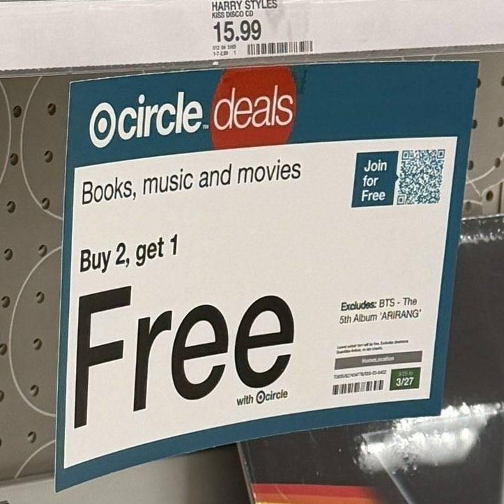 ห้าง Target ในอเมริกา มีโปรโมชันส่วนลดและดีลพิเศษ 'ซื้อ 2 แถม 1' สำหรับสินค้าในหมวดหมู่ Books, Music และ Movies โดยในดีลนี้มีเพียงอัลบั้ม 'ARIRANG' ของ BTS เท่านั้นที่ถูกยกเว้น (ไม่ร่วมรายการแถม)