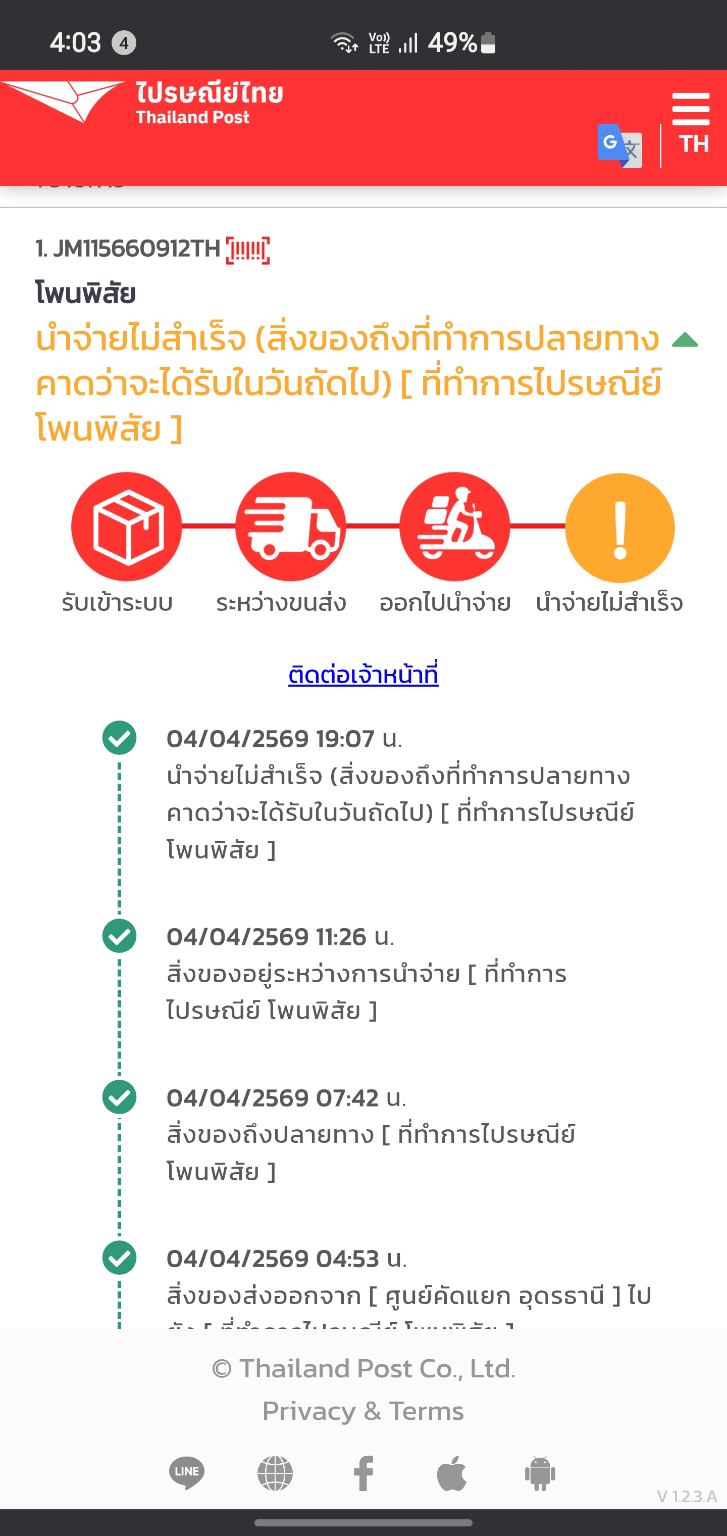 ไปรษณีนำจ่ายไม่สำเร้จใครเคยเป็นบ้างวันนี้วันที่5แล้วยังไม่มีขนส่งโทรมาเลย