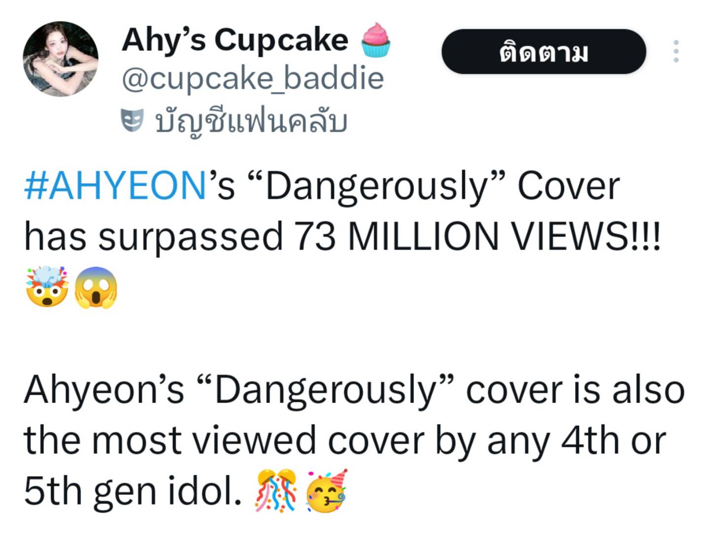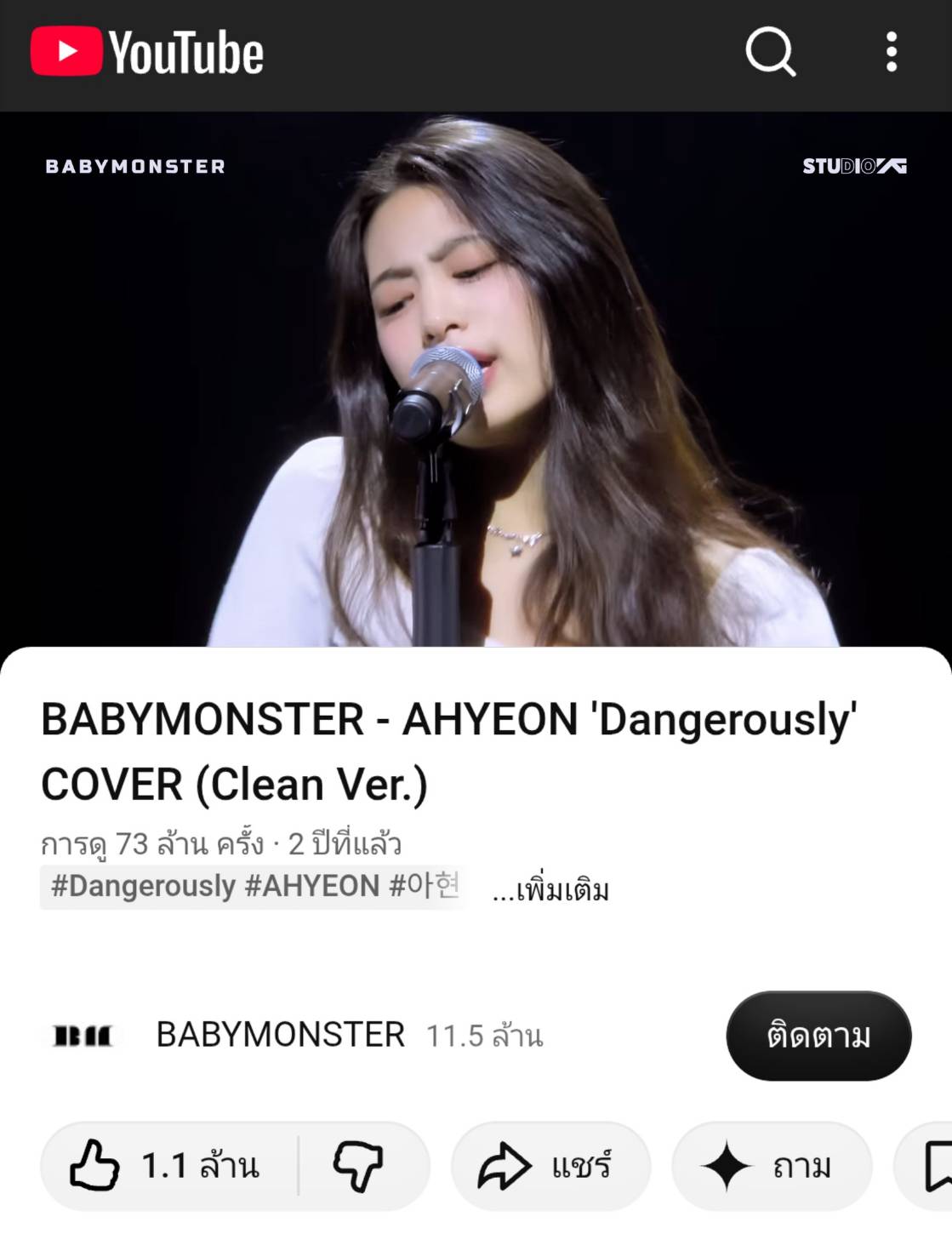 คลิป Cover เพลง Dangerously ของ AHYEON BABYMONSTER ตอนนี้มียอดวิว 73 ล้านวิว สูงสุดในบรรดาไอดอลเคป๊อปเจน 4 และ 5 ทั้งหมด นี่จะ