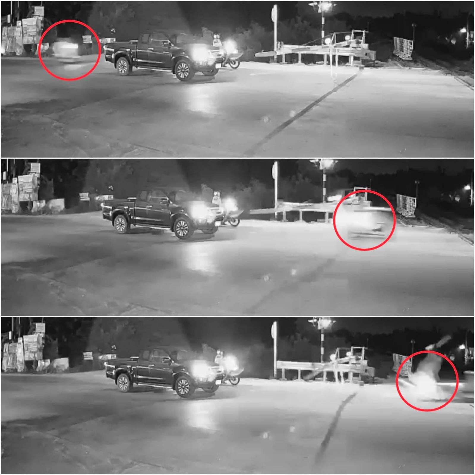 ขณะที่ภาพจากกล้องวงจรปิดที่ติดตั้งอยู่บริเวณสถานีรถไฟบ้านห้วยขวาง พบว่า เหตุได้เกิดช่วงเวลา 04.52 น. ซึ่งรถจักรยานยนต์ผู้ตายได้วิ่งออกมาจากชุมชนห้วยใหญ่ มุ่งหน้าออกถนนสุขุมวิท มาถึงจุดเกิดเหตุ เป็นช่วงที่รถไฟกำลังจะวิ่งผ่าน สถานีจึงเปิดสัญญาณเตือน ไม้กั้นได้ลงมาขวางปิดกั้นเส้นทาง ระหว่างนั้น รถจักรยานยนต์ผู้ตายได้วิ่งมาด้วยความเร็ว พุ่งชนไม้กั้นอย่างจัง จนทำให้รถเสียหลักพลิกคว่ำ โดยพลเมืองดีที่เห็นเหตุการณ์พยายามเข้าให้การช่วยเหลือแต่ไม่ทัน